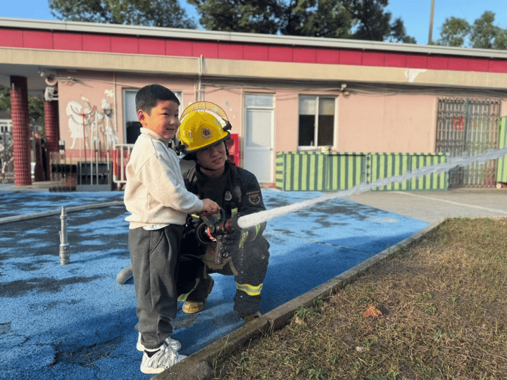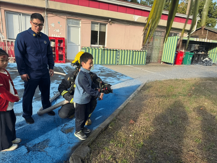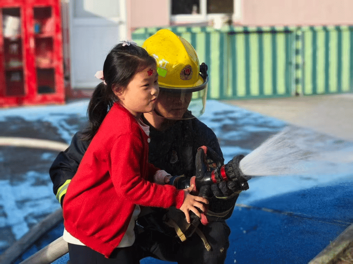 消防员小哥哥还给我们展示了他们的特殊本领:他们熟练地连接消防水管,“唰”的一下,水流直冲天际,像一道白色的水幕彩虹,引得我们阵阵欢呼!