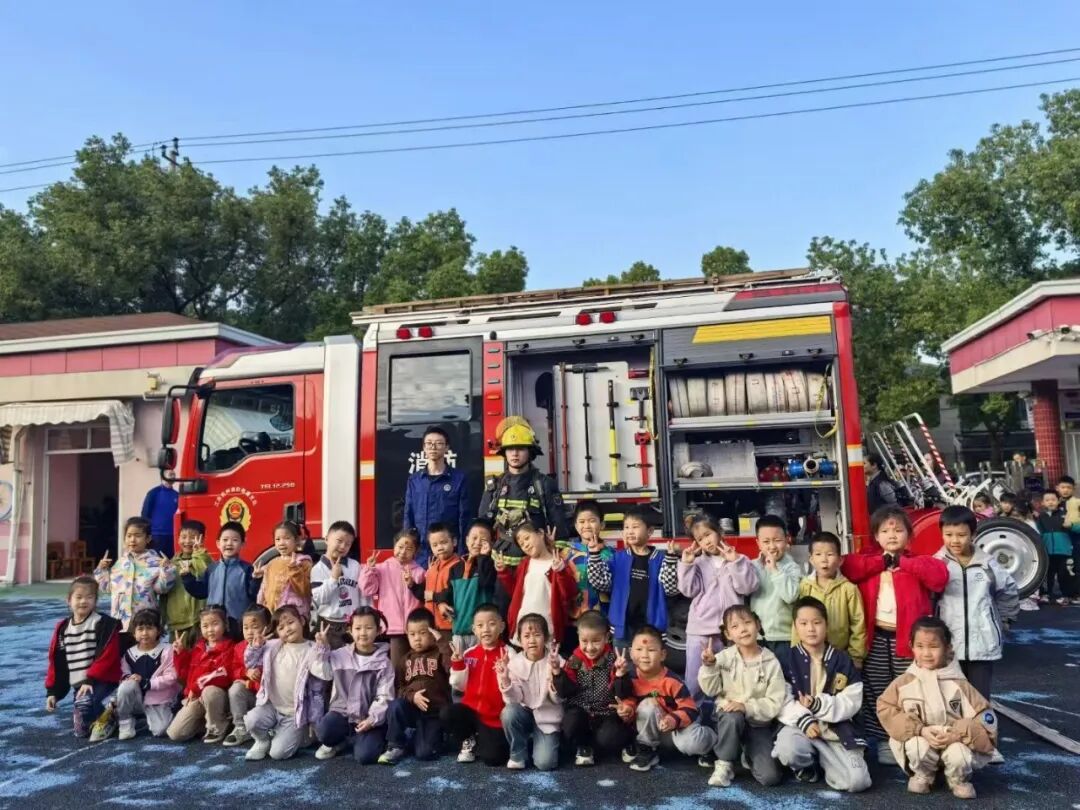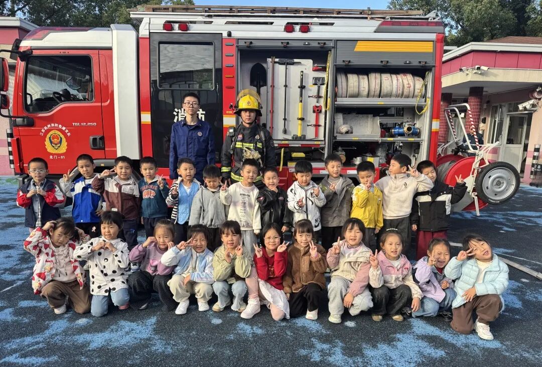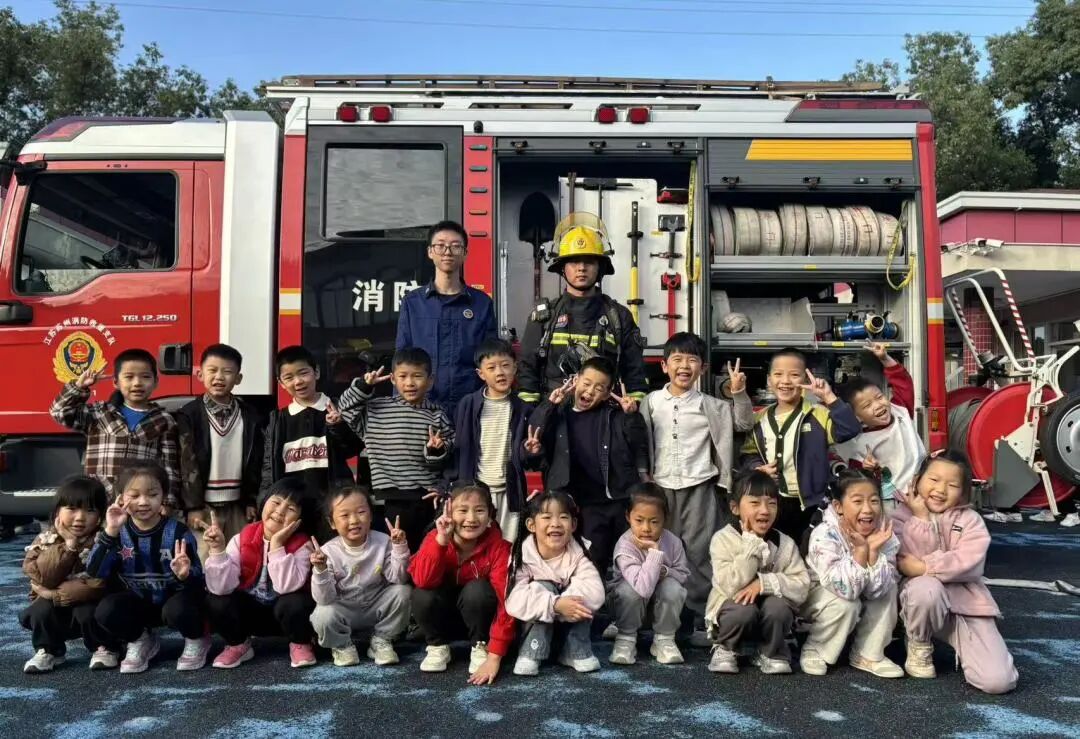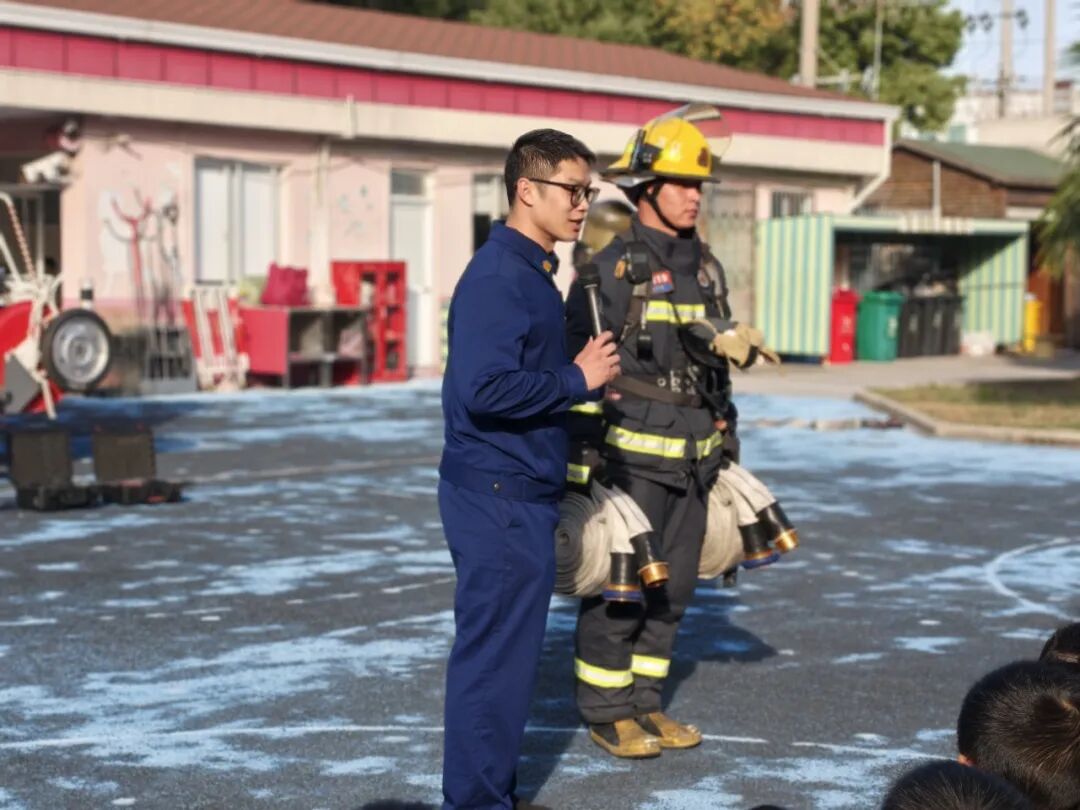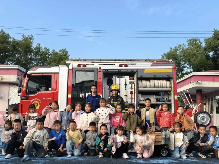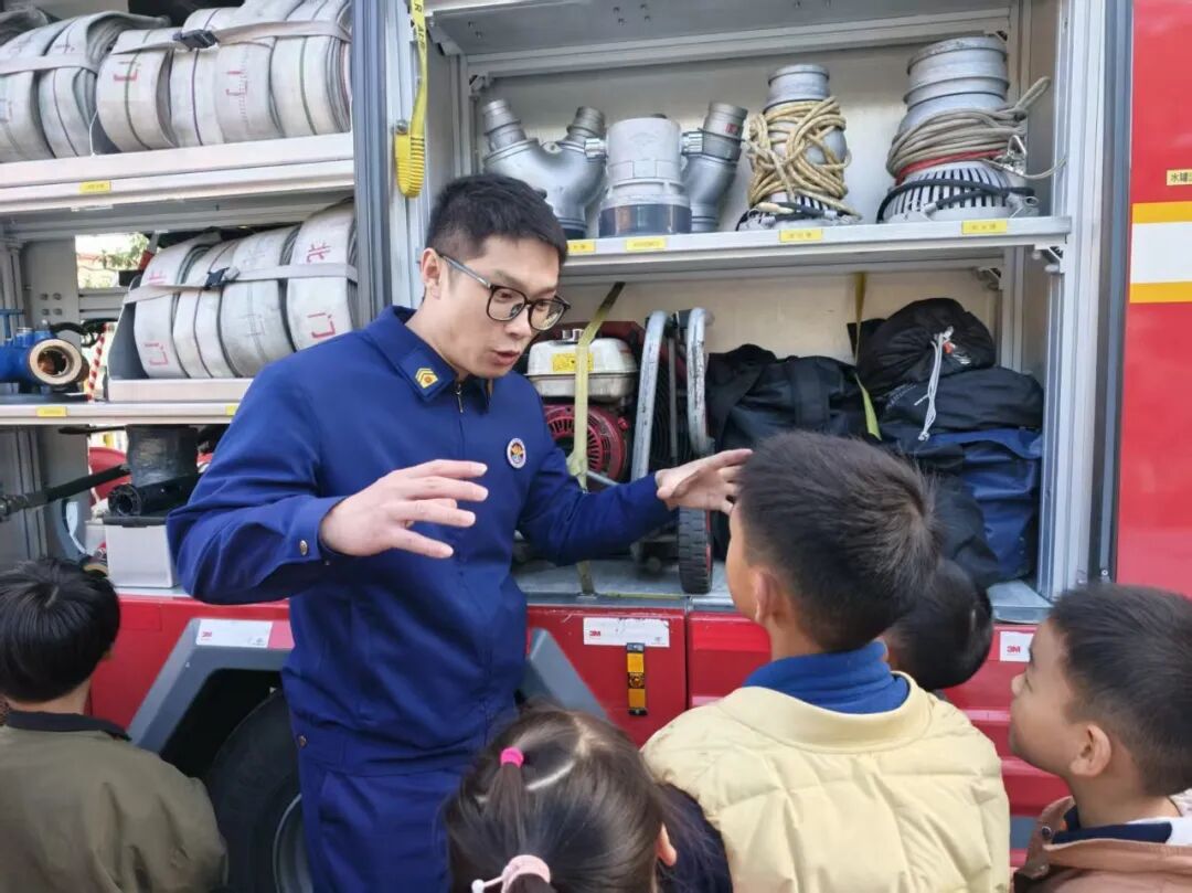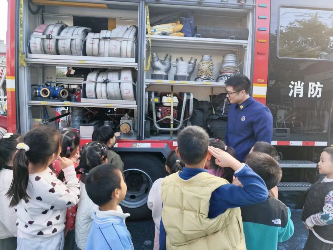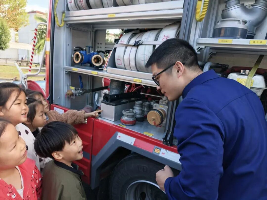 我们近距离参观了消防车,消防员小哥哥认真细致地讲解各类消防器材的用途,还耐心解答了我们的各种问题。