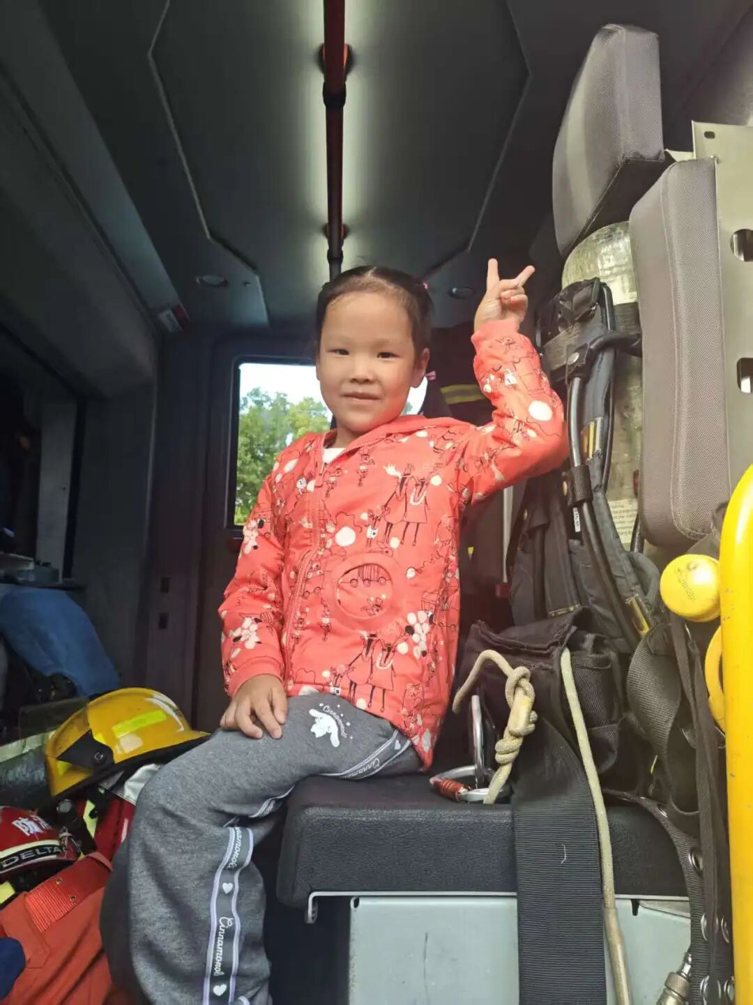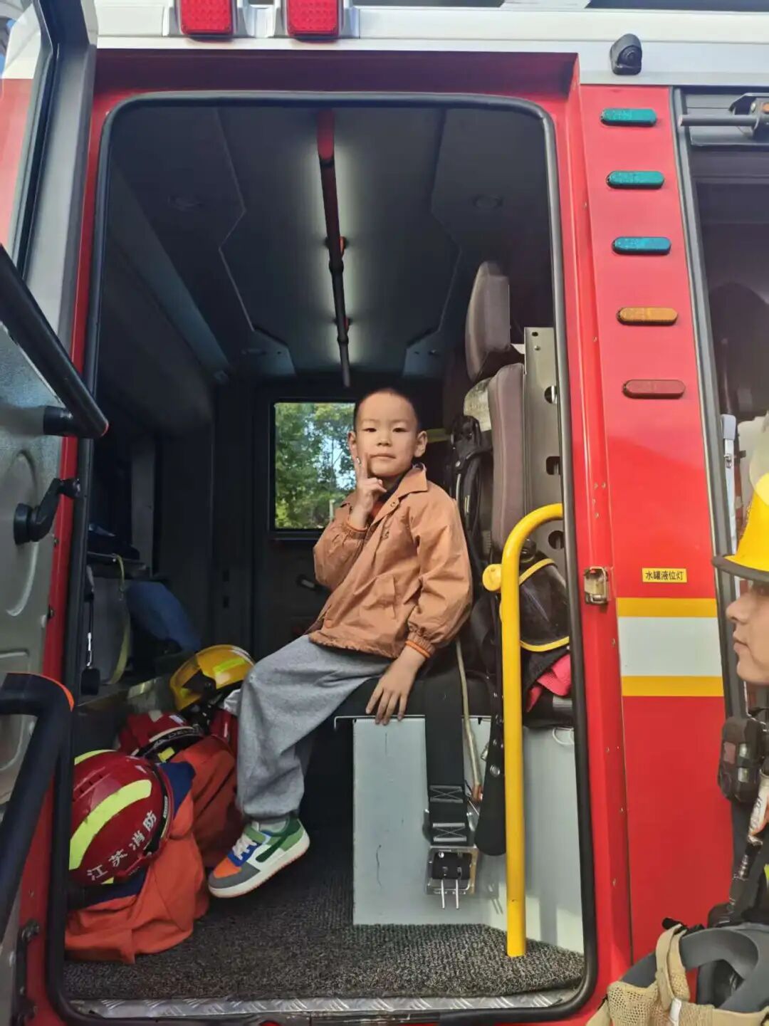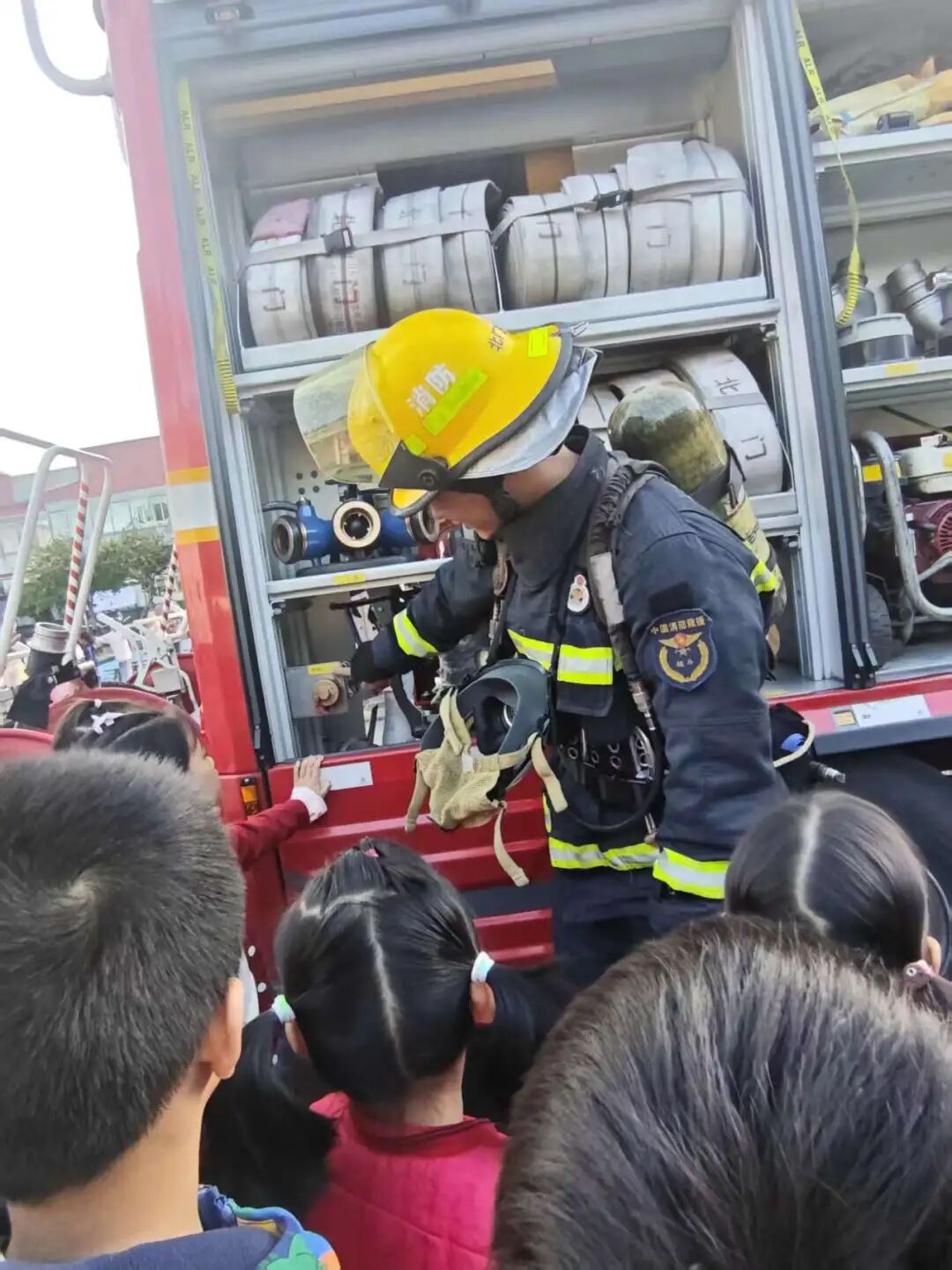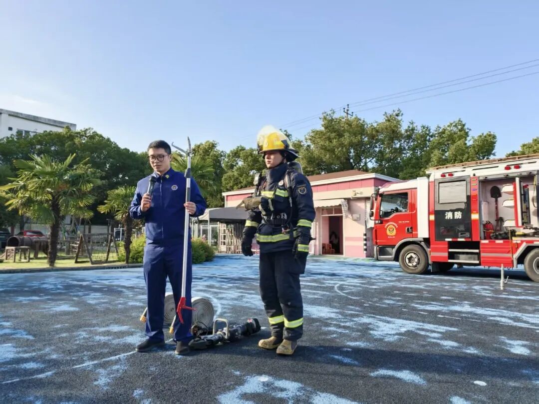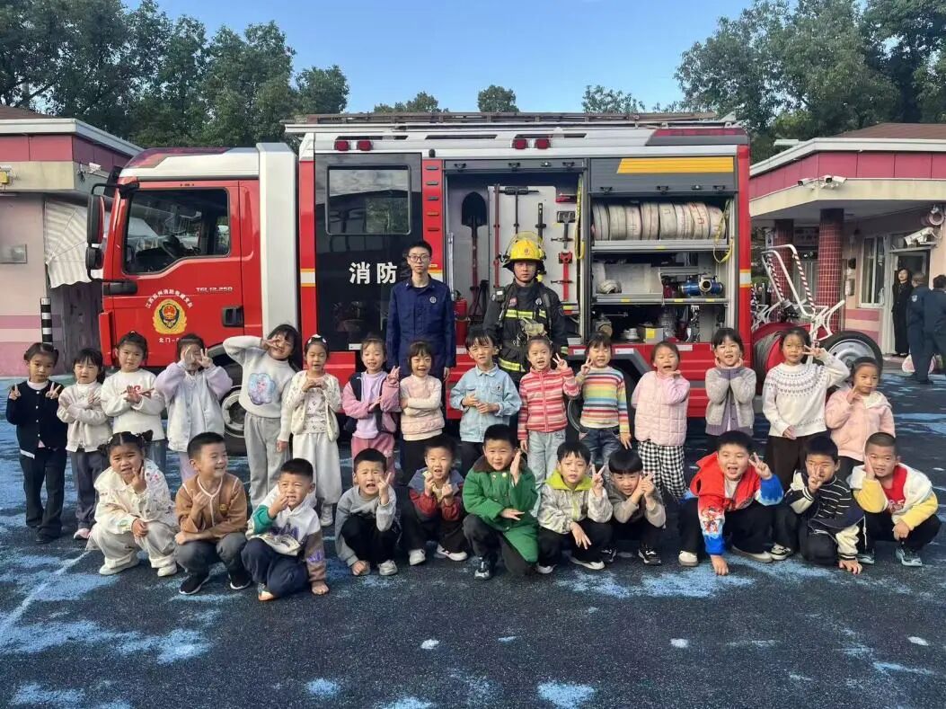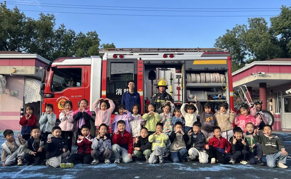 我们近距离参观了消防车,消防员小哥哥认真细致地讲解各类消防器材的用途,还耐心解答了我们的各种问题。