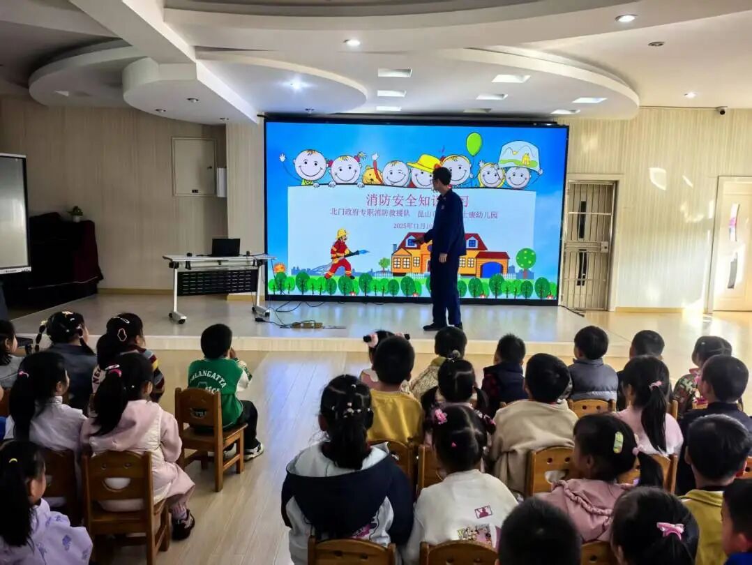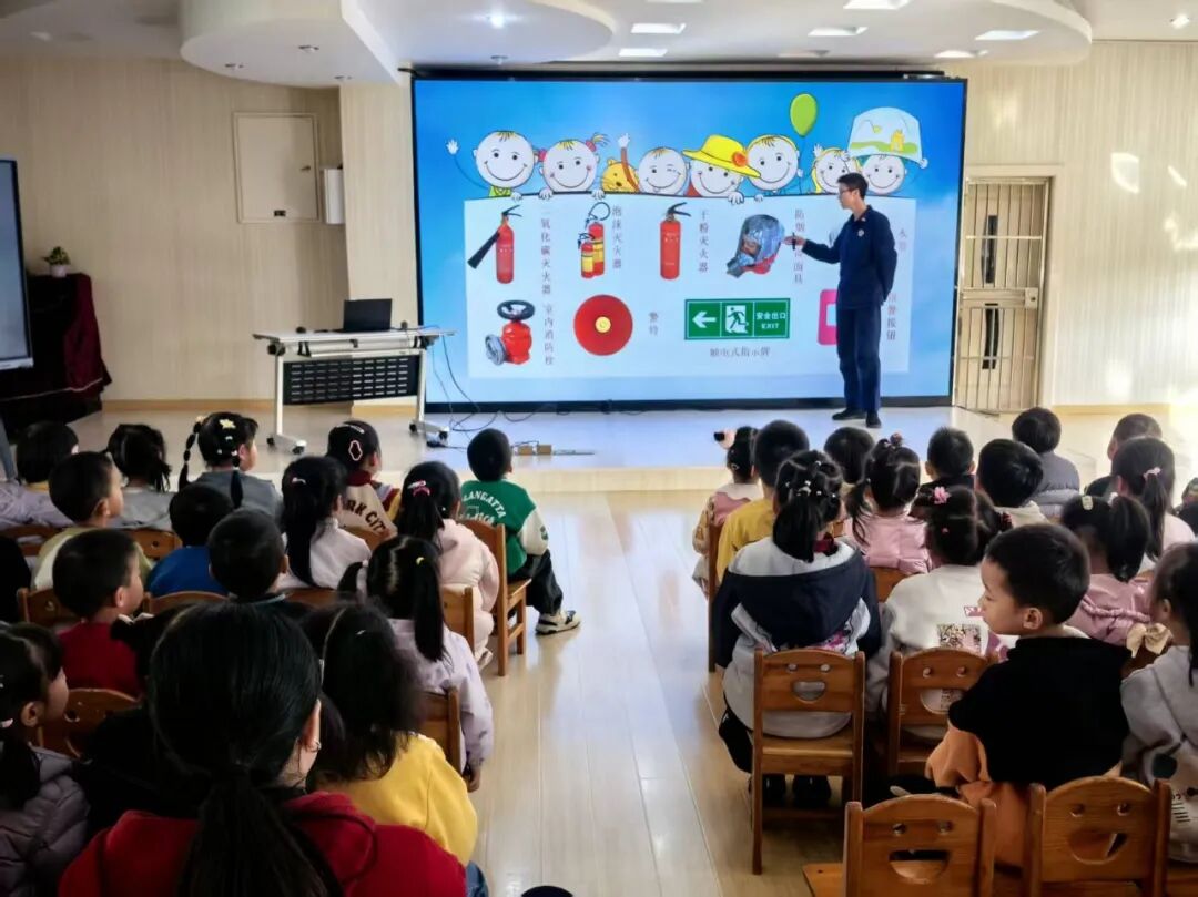 多功能厅里,消防员小哥哥带我们认识了消防器材、逃生出口指示牌和应急灯的作用,我们知道了怎样预防火灾,懂得遇到火情要保持冷静,用湿毛巾捂鼻、弯腰低姿快速撤离,要及时找大人求助。