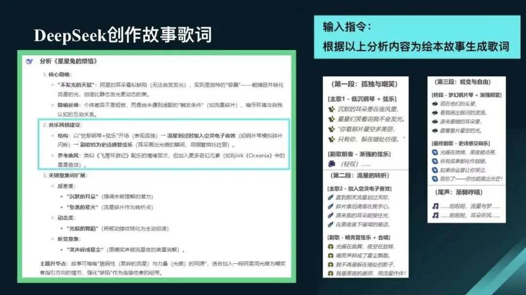 朱老师详细介绍了将传统绘本升级为沉浸式视听作品的AI创作流程:利用DeepSeek完成故事主题、音乐风格与核心意象的分析,依托Mureka AI生成匹配情绪的歌曲,通过海螺AI视频让静态画面动起来,最终用剪映整合为完整音乐故事视频,助力传统绘本变身沉浸式视听体验,有效降低门槛、丰富创意。