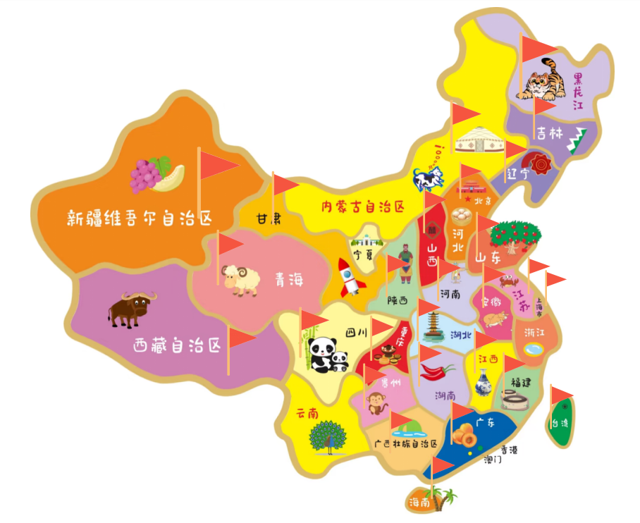 地图上的一面面小红旗,是小朋友们留下的“旅行小印章”!