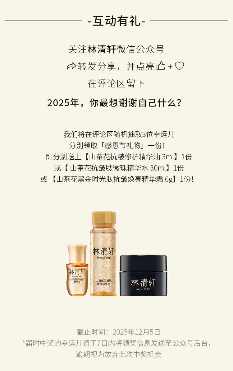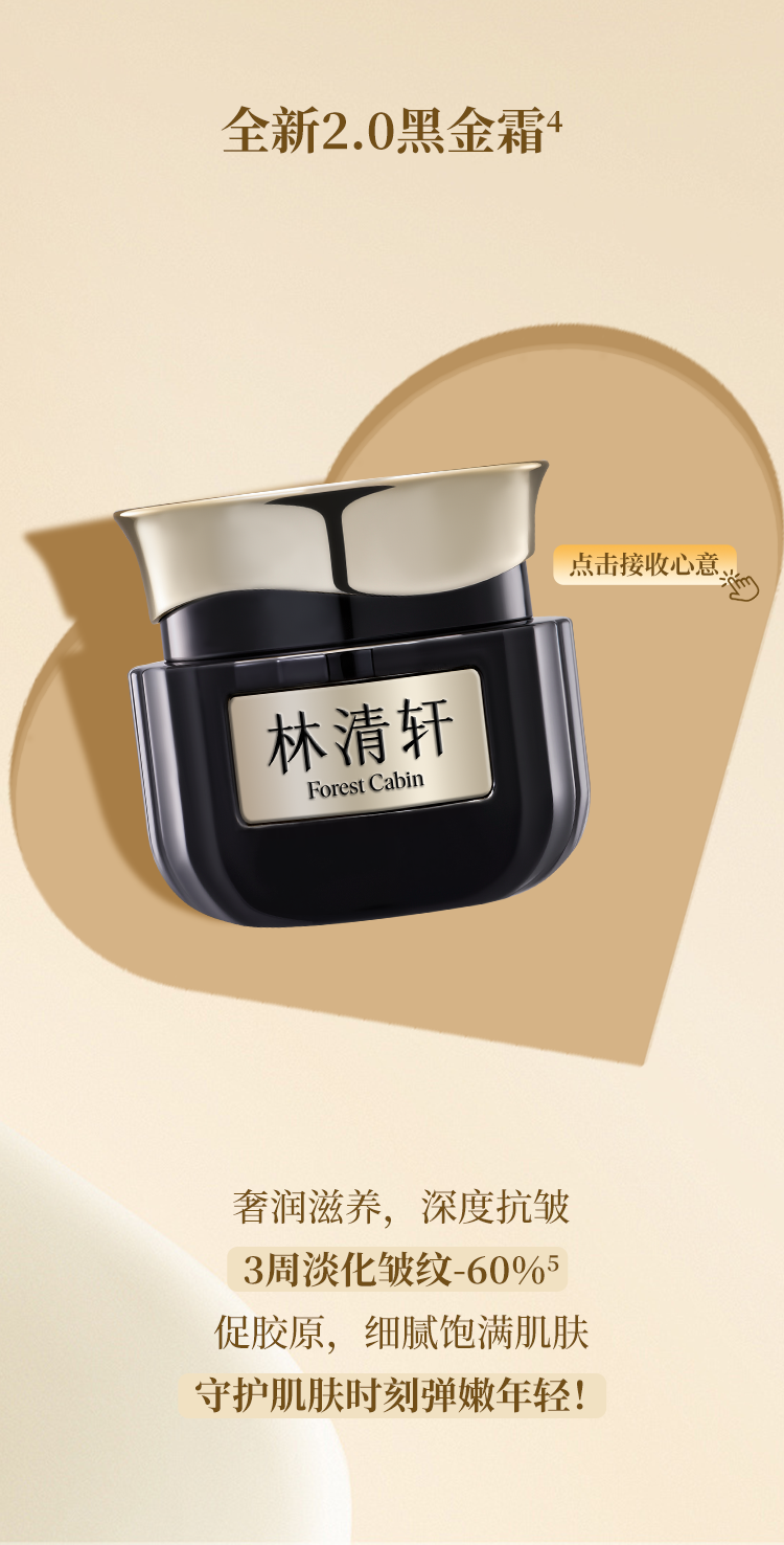 5.数据来源于第三方测试机构,基于30位41-59岁中国敏感皮肤受试者使用林清轩山茶花黑金时光肽抗皱焕亮精华霜21天,通过仪器测试的结果,实际效果因人而异。