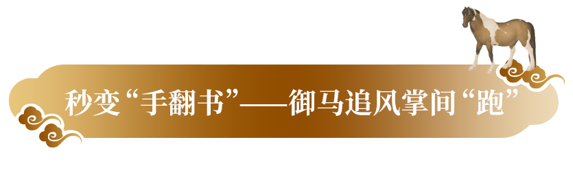 翻动书页,日历便会化作一本灵动的“手翻书”。四匹英姿飒爽的骏马似乎要跃出纸面,盛装舞步、马术跨栏、站立嘶鸣、疾驰飞奔……它们穿越数百年的时光,在此献上一场独一无二的“掌上马术表演”。