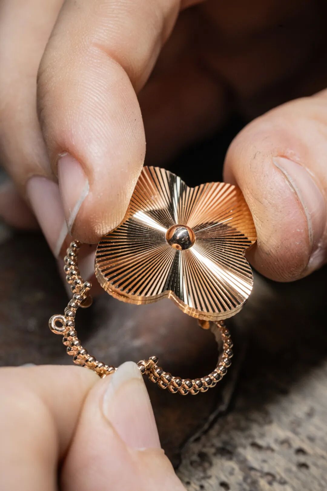 2025年,Alhambra系列再以主题图案尺寸与材质变化焕新亮相,更融入了梵克雅宝另一标志性的工艺——可转换式设计。从1938年面世的Passe-Partout万能珠宝,到更为大名鼎鼎的Zip项链,梵克雅宝赋予了高级珠宝更为多元实用的佩戴方式。起初,这些可转换式设计只应用于贵重且复杂的高级珠宝之上,为名流淑女的晚宴造型增添变幻。随着时代风潮的转变,更为轻便日常的珠宝占据了人们的生活,近年来,可转换式珠宝传统在Alhambra四叶幸运系列中亦得以延续,为日常珠宝增添更多变的风格。