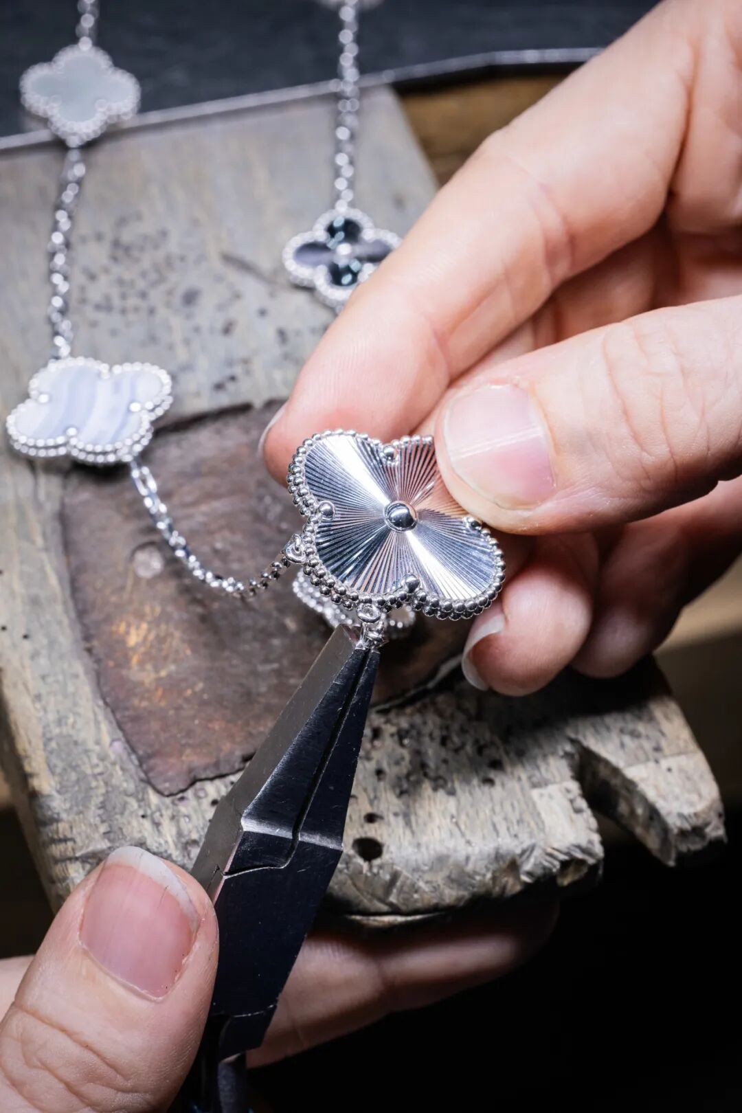 多个不同材质、大小的四叶幸运主题图案看似随意排布,背后是精心的考量,尺寸的大小、材质的选用,排布顺序,乃至链条长度,都在经过了多次艺术性的推敲与修订,从而确保佩戴时的垂坠感与整体比例的和谐美感。