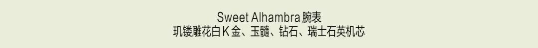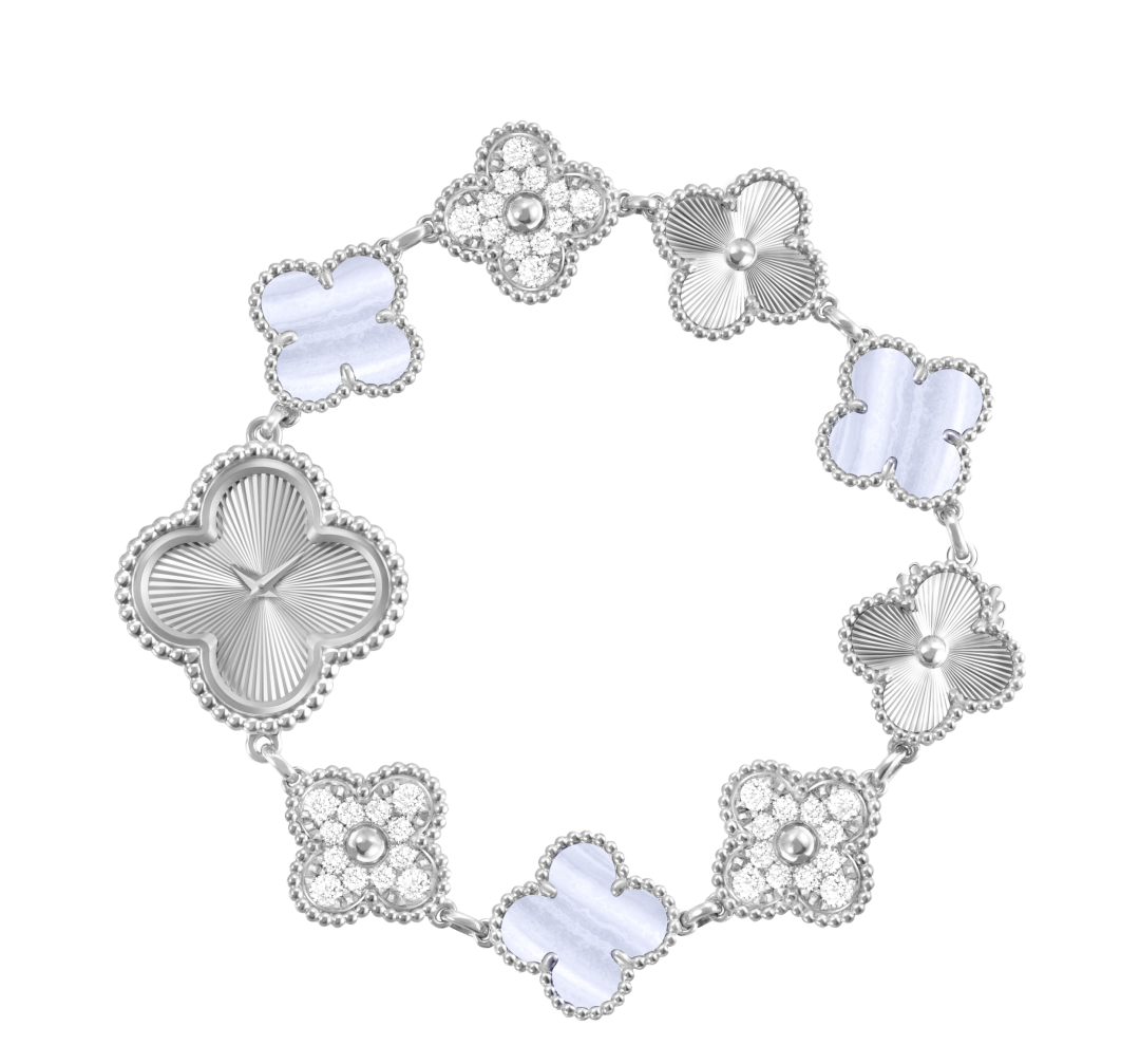 珠宝与时计,在梵克雅宝的叙事中,亦是密不可分的篇章。本次新作中亦呈现一枚全新Sweet Alhambra腕表,为世家时计作品再添新章,以优雅细腻的方式诠释时光流转。四叶草造型表盘由白K金打造,玑镂雕花白K金与金质圆珠互为呼应,将世家精巧的金属处理技艺展现得淋漓尽致。玉髓、玑镂雕花白K金和镶钻四叶幸运主题图案交错排列成表链,每一枚四叶幸运主题图案的边缘皆经过镜面抛光,以细腻金珠环绕,玉髓的柔光与钻石的火彩、玑镂雕花的光芒交相辉映,是腕表,还是精美的手链?刹那间恍然难辨。