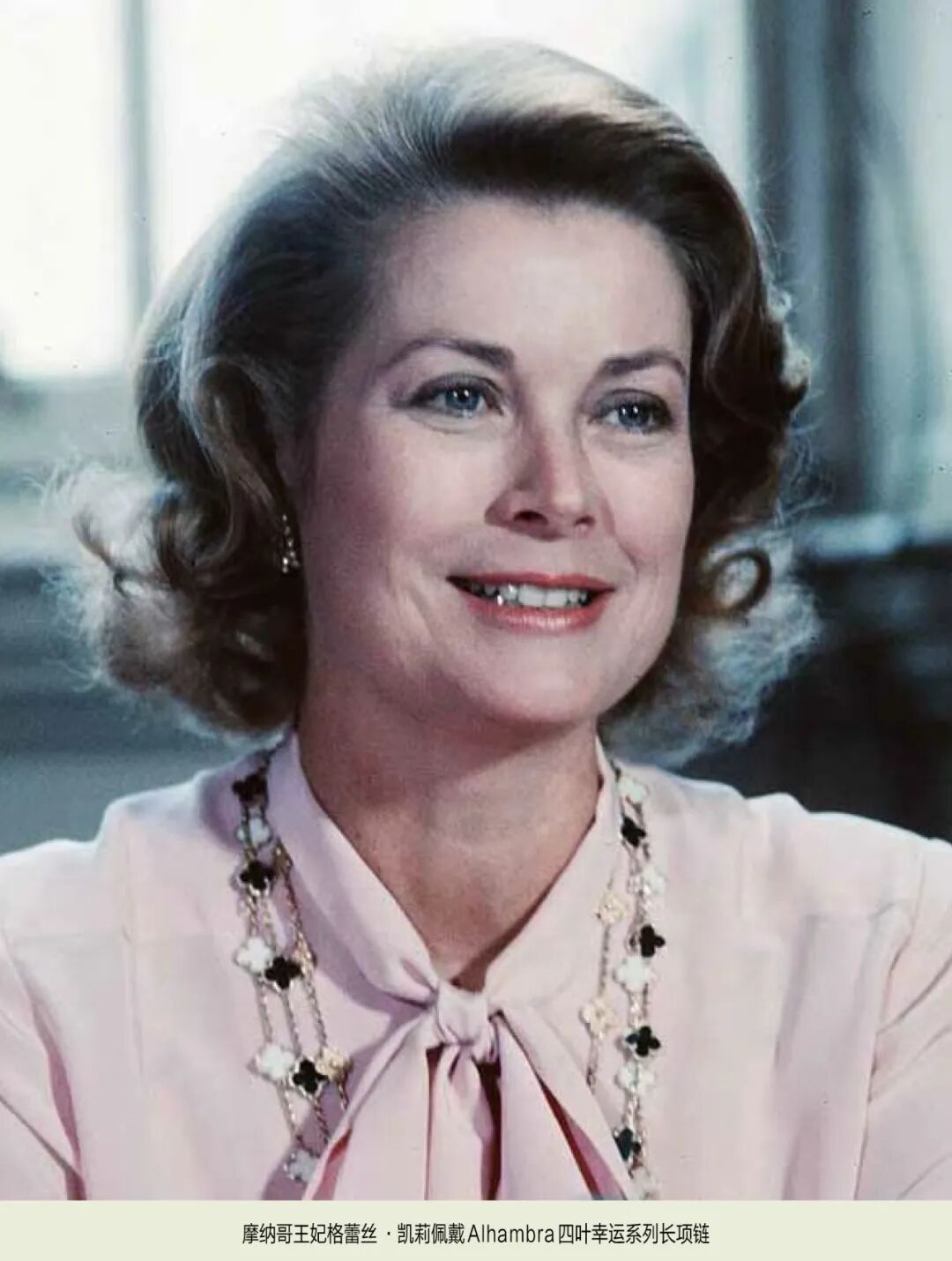 1968年,梵克雅宝推出首款Alhambra系列长项链,灵感就来源于四叶草,由20枚带黄K金褶边的四叶幸运主题图案组成,并以打磨圆润的金色圆珠饰边,一经推出便大获成功,这种适合于日常佩戴的珠宝,受到了当时的名流人士的追捧。摩纳哥王妃格蕾丝·凯莉经常在公开场合和私人宴会将各种不同的宝石与材质的Alhambra长项链组合叠戴,搭配丝质衬衫等日常服装,打造出简约而不失优雅的独特风格。