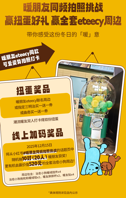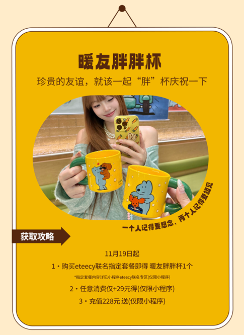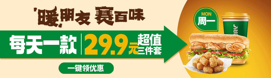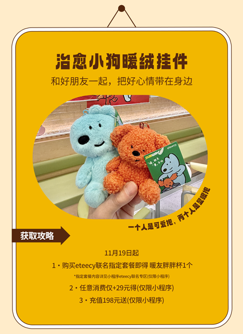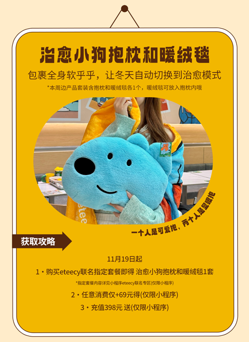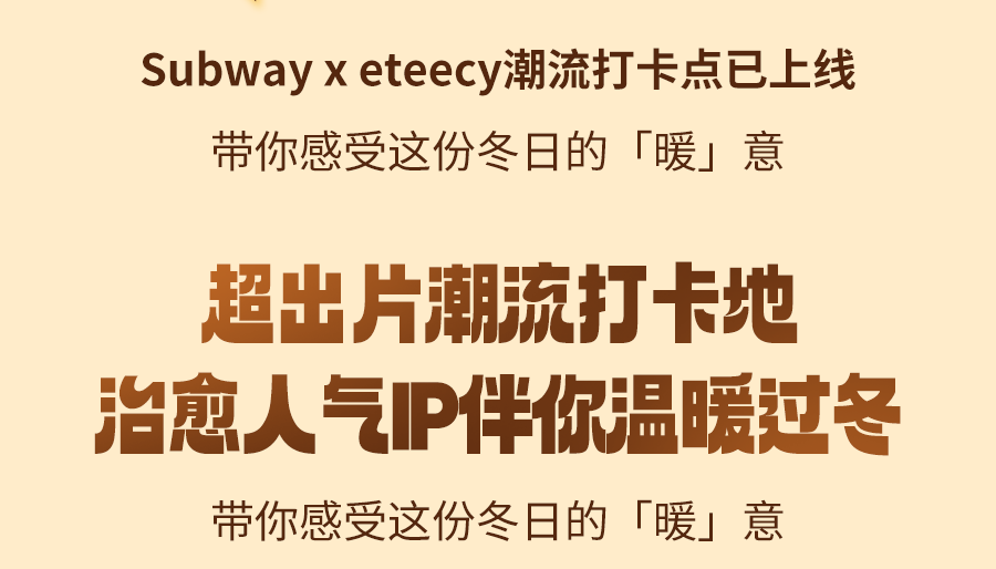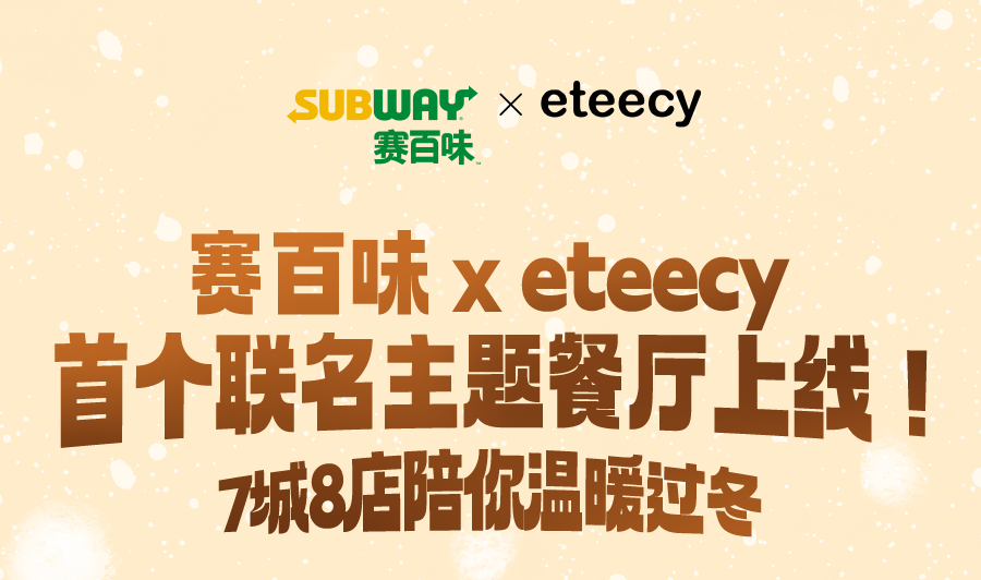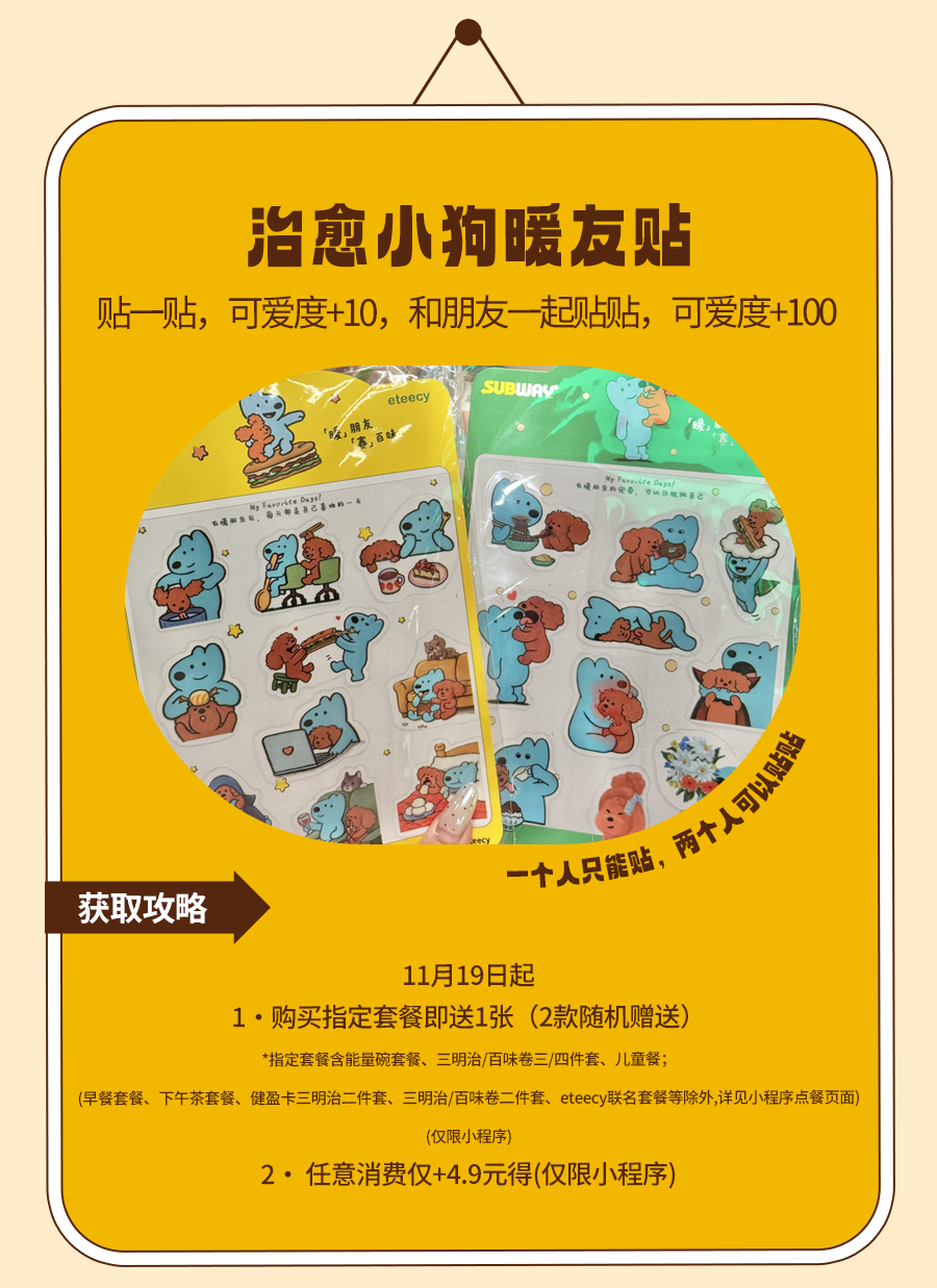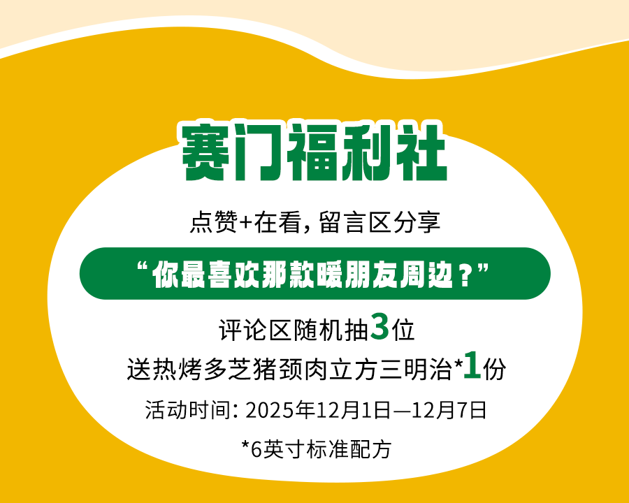 上述周边赠品限2025年11月19日起于SUBWAY®赛百味中国大陆地区部分餐厅供应,机场、火车站等交通枢纽餐厅、旅游景区餐厅、园区内部餐厅等特殊餐厅除外,具体以餐厅公示为准。产品、周边以实物为准,以上为创意图片,仅供参考。暖友卡限量【300000】张(共【6】款样式,【六】选一随机发放);暖绒挂件限量12000个(共两款样式可选);胖胖杯限量9000个;抱枕和暖绒毯限量5400个;暖友贴限量75000张(共两款样式,二选一随机发放)数量有限,售完即止;eteecy联名套餐包含产品详见小程序菜单,具体内容以门店实际售卖为准。活动仅适用于赛百味支付宝小程序,赛百味微信小程序及线下门店柜台点单,不适用于第三方外卖平台、大众点评、抖音等其他网上订餐渠道。SUBWAY®赛百味可以在法律允许的范围内对活动进行适当调整。Subway® is a Registered Trademark of Subway IP LLC © 2025 Subway IP LLC.