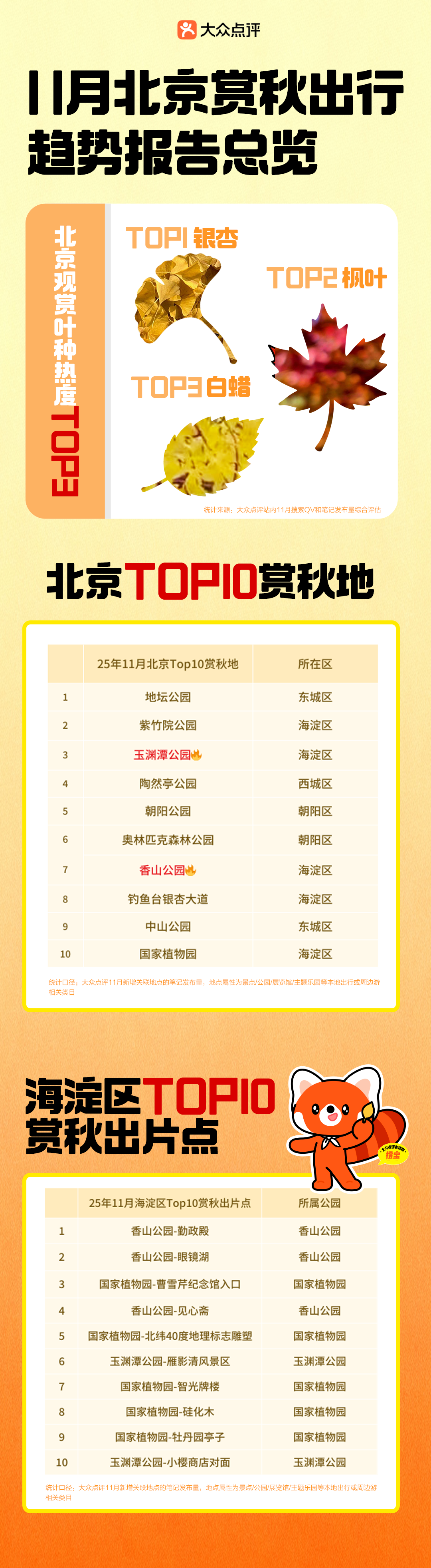 如今,一棵好看的树,本身就足以成为用户秋日出行的理由。对比去年11月的北京Top赏秋地排名,今年香山公园和玉渊潭公园排名明显上升;下探原因发现,推动其热度飙升的并非传统意义上的广阔秋色,而是园内那些具有独特魅力的树木: