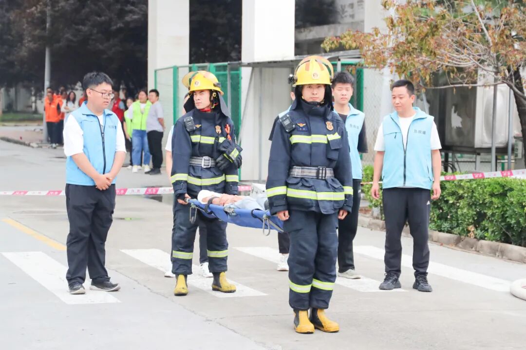 后勤组在厂区大门口接应119/120进入园区并指引至事发区域,救护组配合119消防战士搜救被困员工,警戒组做好周边警戒工作防止无关人员进入危险区域,应急编组成员忙而不乱有序按应急处置流程行动。