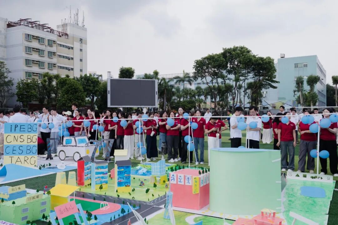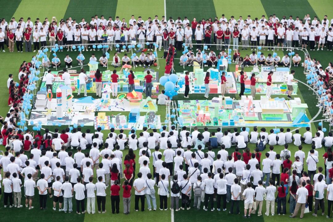 大家把组装好的部件拿到运动场,在广阔的大草坪上共建未来家园,有楼房、公园、绿化、工厂、马路、火箭、星球,一通操作下来,带着富士康元素的未来城市“生长”在运动场上,满满的科技感爆表。