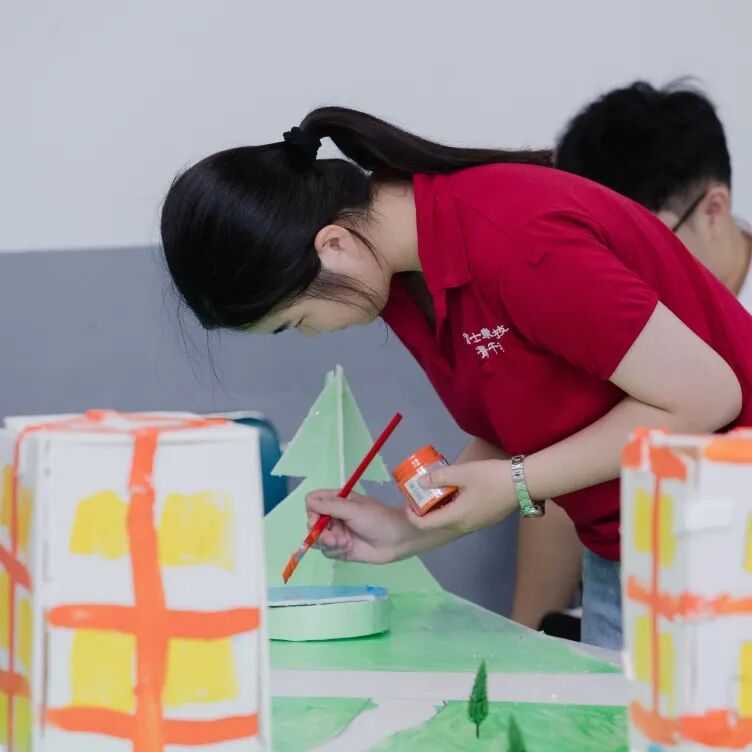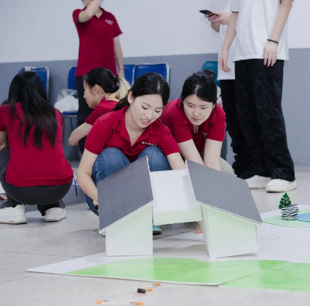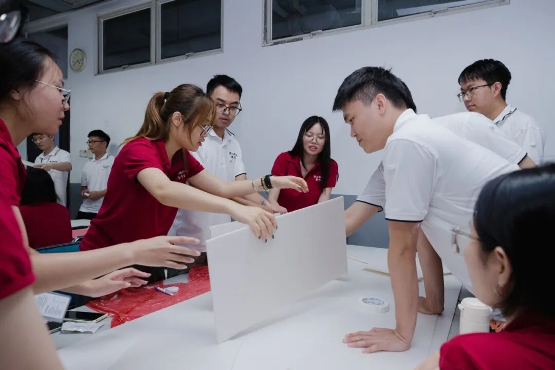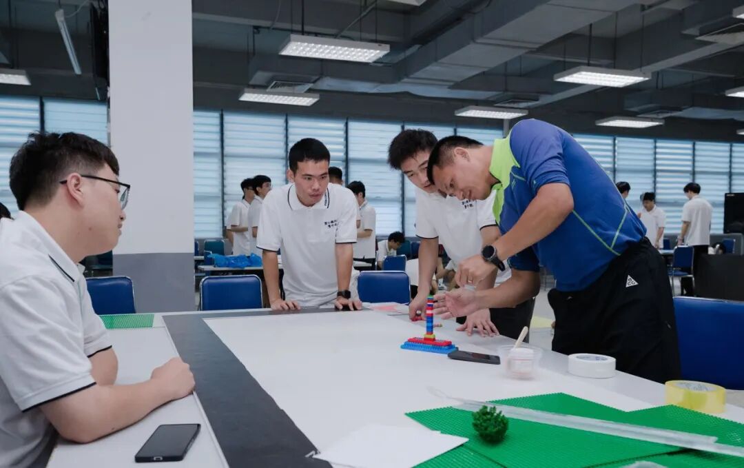 了解完规则后,大家在教练的指导下,自己动手,融入思考与创意,用积木和纸板拼装出各式各样、惟妙惟肖的组件。有好点子的同学,组织大家讨论,如做到何更完美、更“菁”彩。