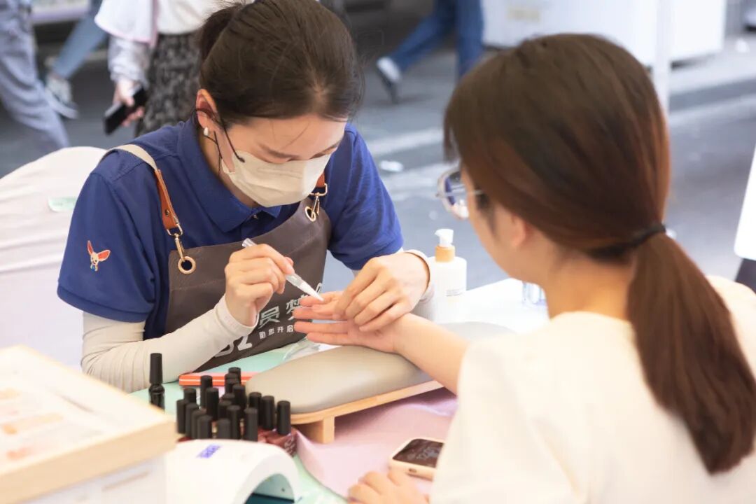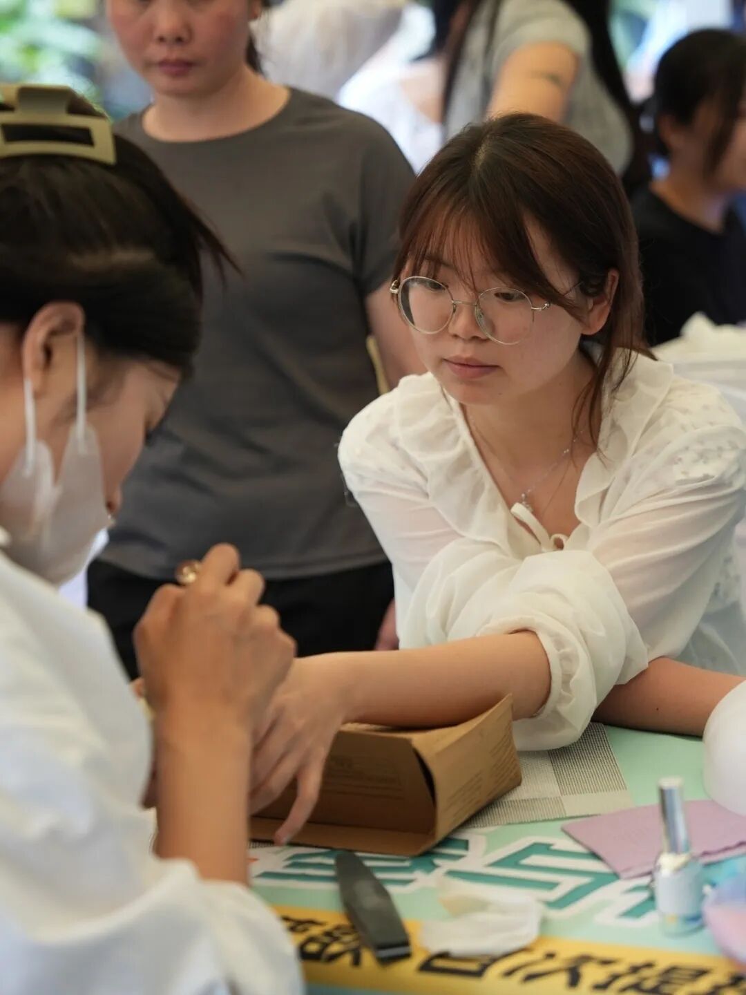 另一边,员梦金美甲设计组特意为每一位到场员工打造指尖艺术。美甲师们精心挑选、认真打磨,提供各种颜色指甲油供员工选择,再根据女孩们的喜好和手型,为她们设计出多彩美甲款式。