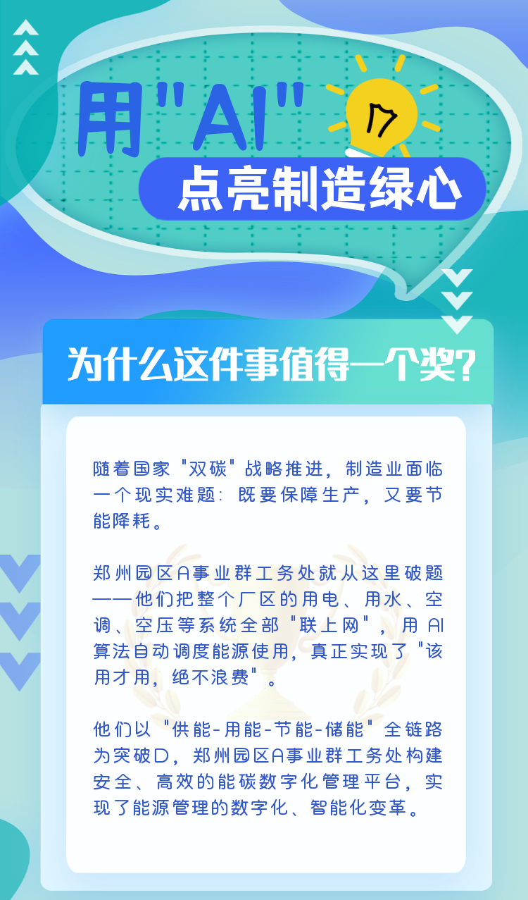 富士康A事业群郑州园区工务处凭借“能碳数字化管理平台”,实现年减碳近2万吨,等效植树110万棵的绿色成果,成功将厂务管理从“人工经验”升级为“AI驱动”,荣获“绿色智能奖”。