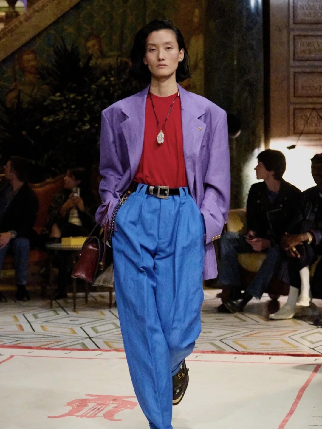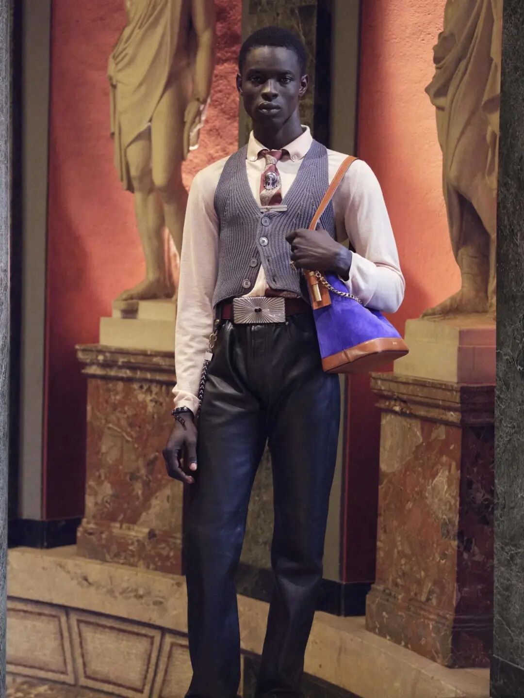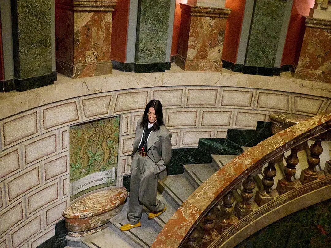 大秀的舞台设计颇具 “颠覆性”:Vitale 用 “未整理的床铺” “家用电器” “锅碗瓢盆” 等日常物件布置秀场空间,与画廊古典气质形成对比,企图营造一种 “日常生活 + 奢华、纪念与颓废感混合” 的氛围。