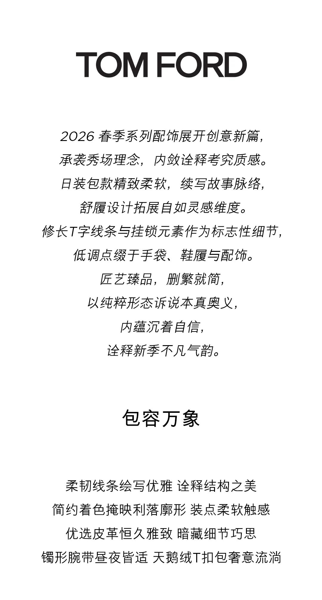 摘要:TOM FORD 2026 春季系列配饰,精湛匠艺解译含蓄风姿