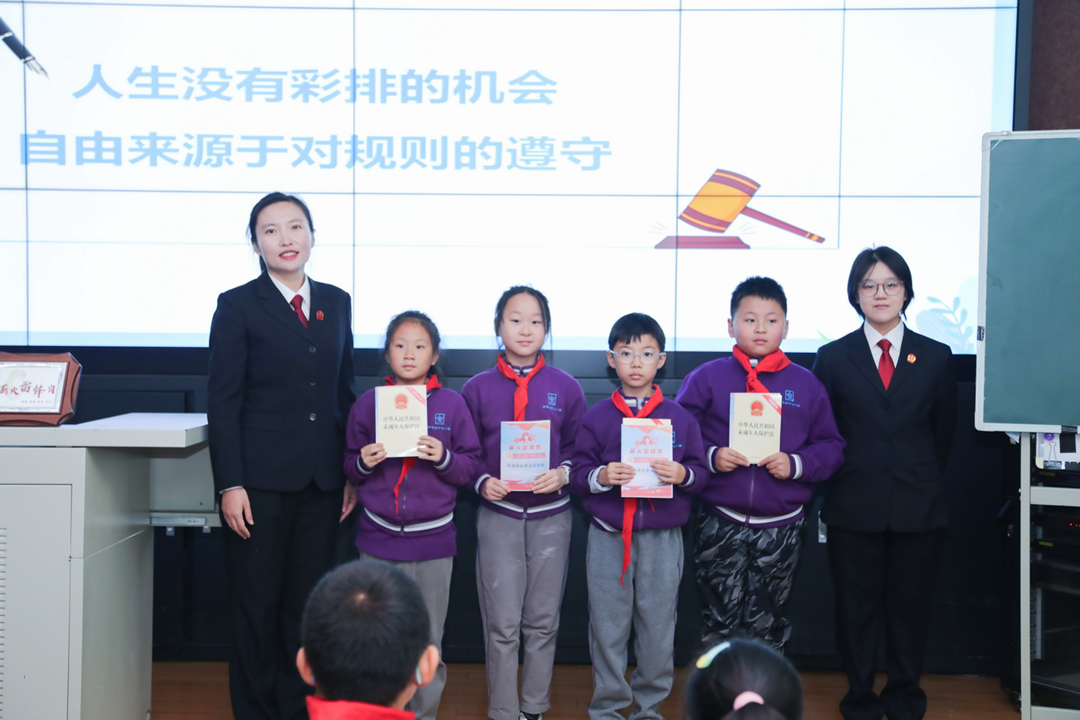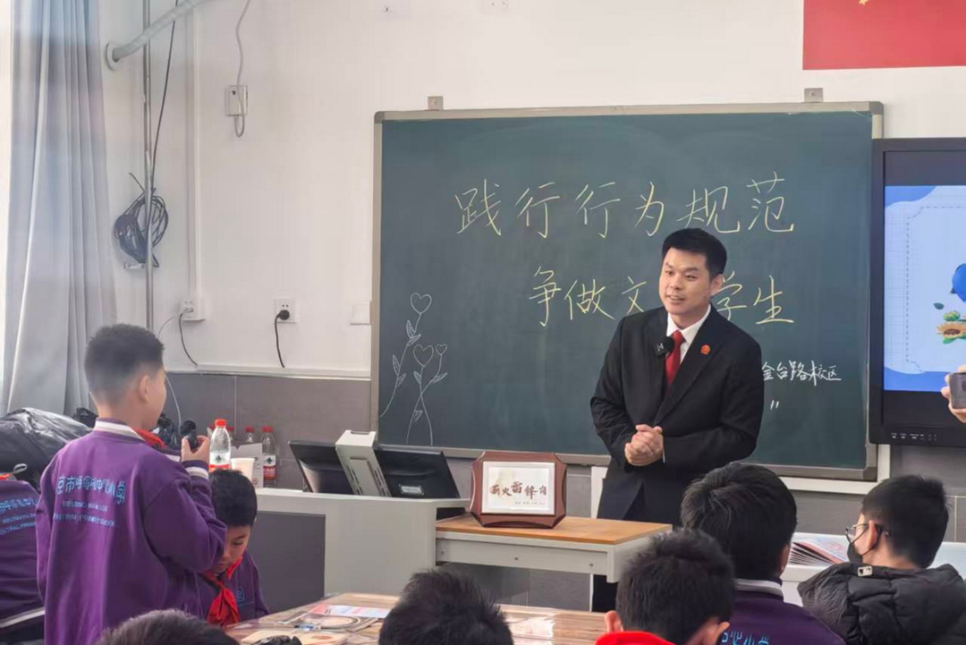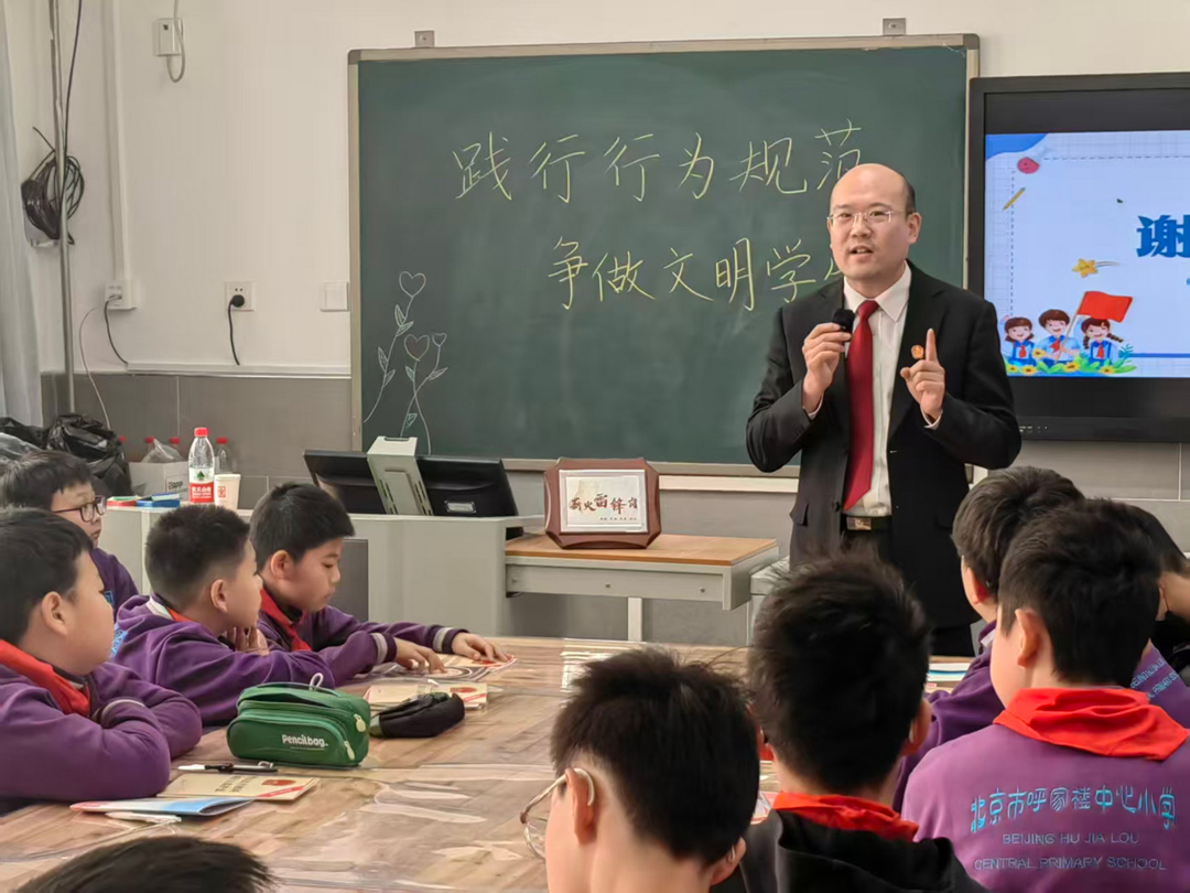 民二庭“薪火雷锋岗”走进呼家楼中心小学金台路、团结湖校区开展普法宣传活动,为两校区近千余名师生带来生动有趣的法治启蒙课。在金台路校区,李增辉庭长和周剑彬法官以“践行行为规范,争做文明学生”为题,从“什么是行为规范、为什么要遵守行为规范、行为规范与法律的关系”三方面内容展开解读。