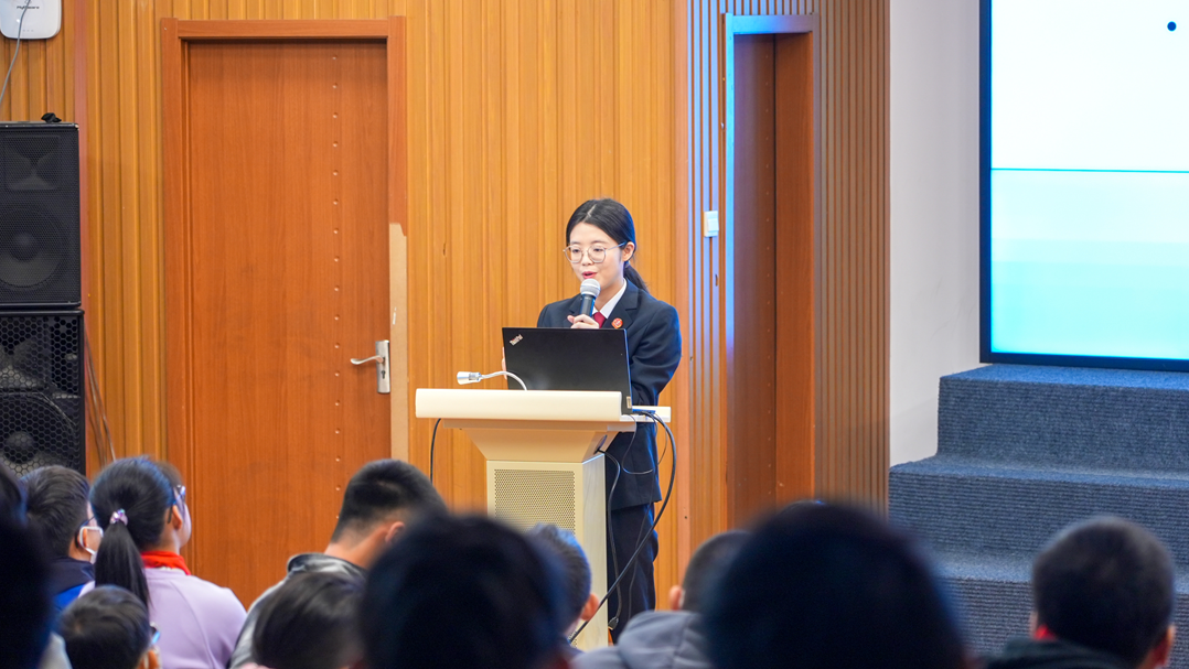 “行为规范是社会、学校以及家庭共同遵守的‘行动小指南’,如灯塔般穿透迷雾,引船只奔赴远方。”周剑彬向同学们讲解行为规范与法律的内在联系,通过真实案例、生动比喻和互动交流,让同学们深刻理解了行为规范与法律的关系。