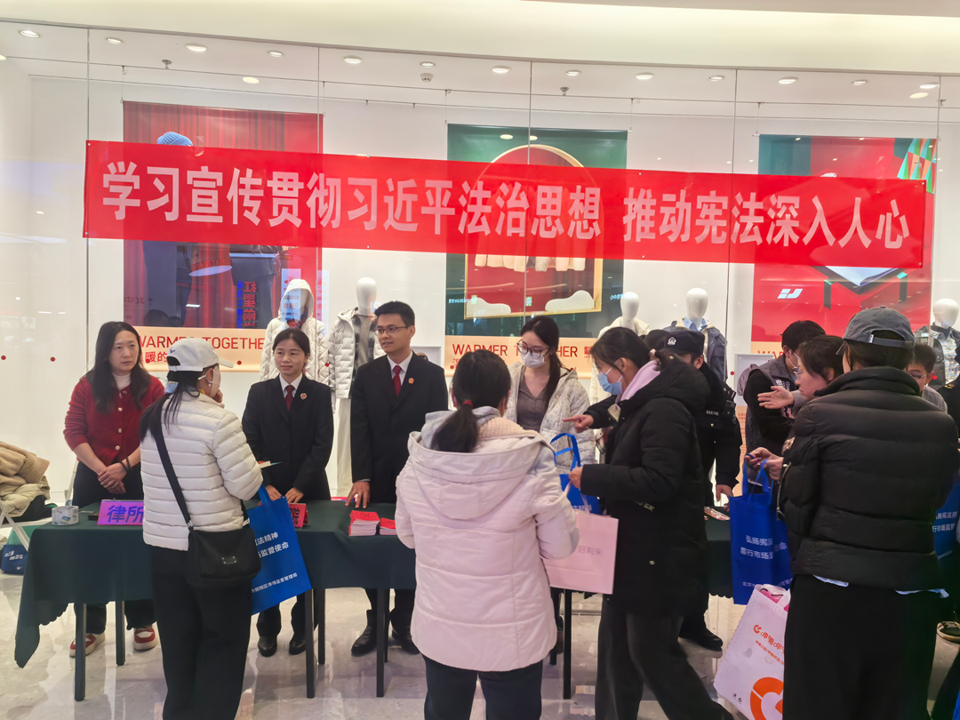 温榆河法庭联合东坝乡综治中心开展“12.4宪法日普法宣传活动”。法官韩龙、书记员刘佳星前往东坝万达广场,现场普及《宪法》《民法典》等与群众日常生活密切相关的法律知识,并对民营企业风险防控、安全生产、劳动者权益等领域法律咨询进行解答。利用东坝万达广场户外屏幕循环播放宪法宣传片《温度》,将法治理念和法律知识精准送到群众身边。