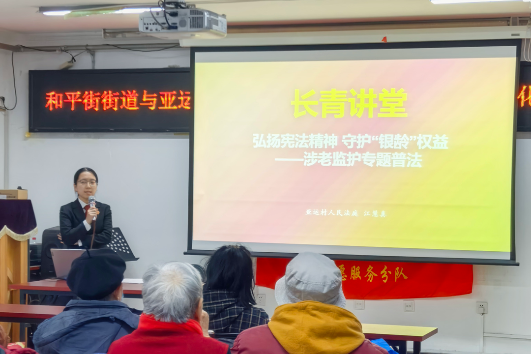 亚运村法庭联合和平街街道,在和平东街社区开展“长青讲堂”常态化普法活动的启动仪式,并针对该社区老年人多、监护需求多的实际情况,亚运村法庭的法官助理江慧真围绕涉老监护等相关问题,为社区工作人员及居民送上“长青讲堂”普法“第一课”。