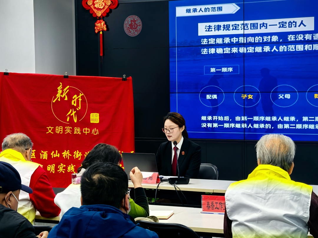 酒仙桥法庭法官助理宁昭璐走进酒仙桥街道开展普法讲座,以宪法为切入点,用生活案例解读宪法作为根本法与居民生活的紧密联系。结合居民现场互动提问,围绕遗产范围、继承人资格、遗嘱效力等问题,用通俗语言拆解法律条文,有效提升了社区居民的宪法意识与法治素养。