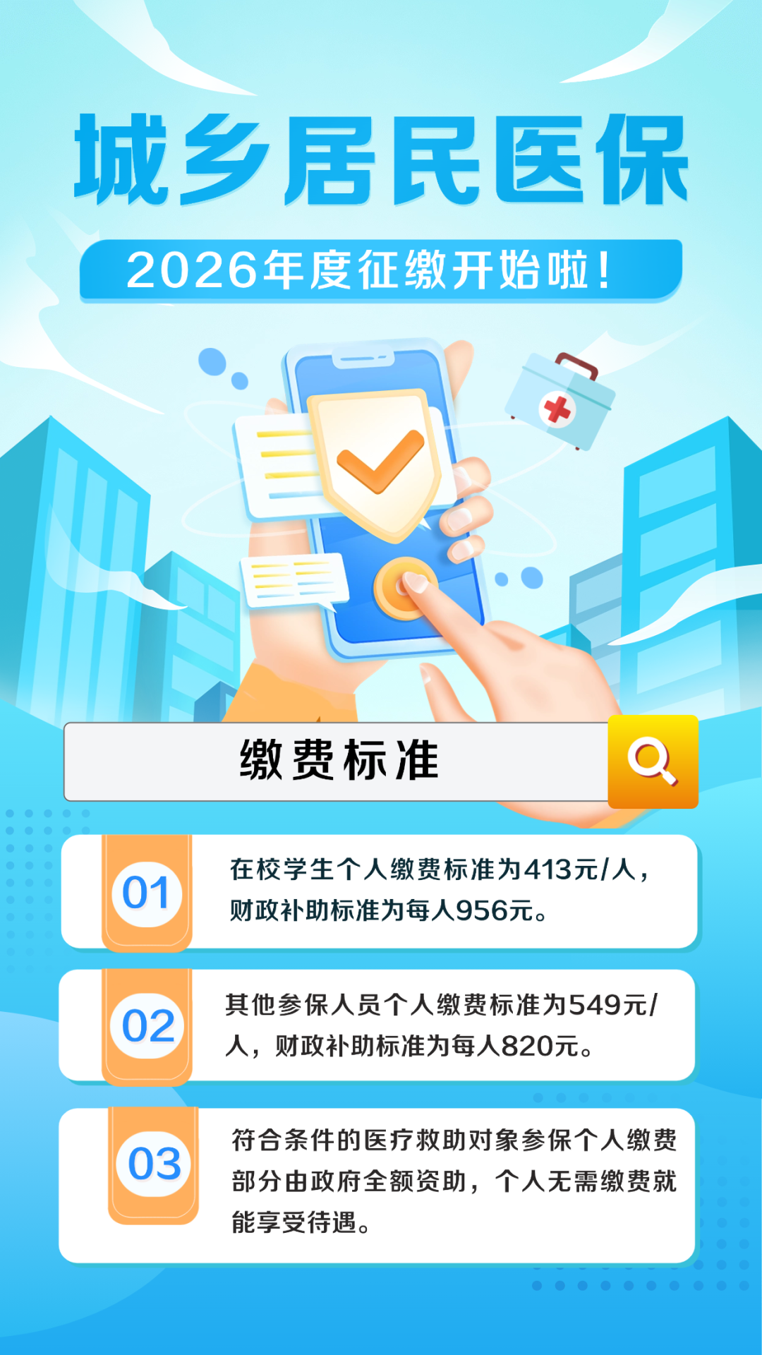 2026年度广州市城乡居民医保的缴费标准与上年度保持一致,具体而言,在校学生个人缴费标准为413元/人,财政补助标准为每人956元;其他参保人员个人缴费标准为549元/人,财政补助标准为每人820元。除此之外,符合条件的医疗救助对象参保个人缴费部分由政府全额资助,个人无需缴费就能享受待遇。