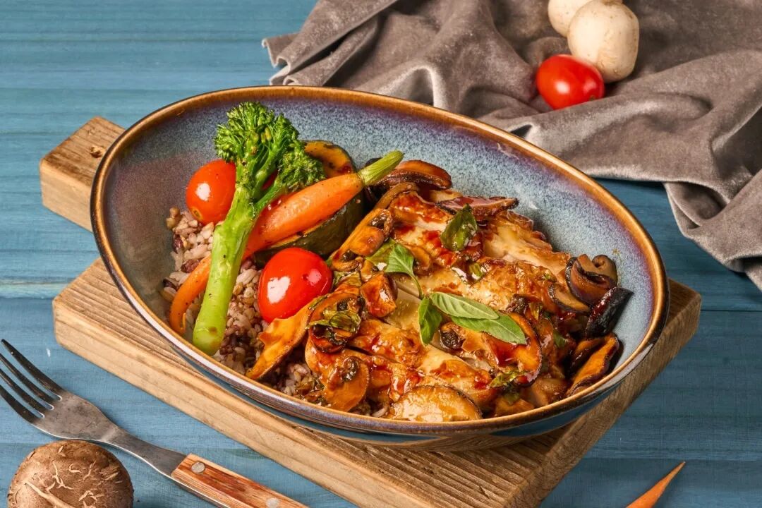 Mixed grain rice coated in basil and mushroom sauce.Paired with a crispy-on-the-outside, tender-on-the-inside grilled chicken leg.Every bite is bursting with unique aroma.Garnished with fresh vegetables, adding a touch of savory sweetness and caramelization.
