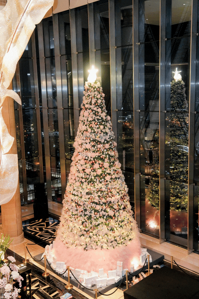酒店于50层空中大堂点亮一棵8.4米高的 Repetto 联名圣诞树,以标志性粉色与精致装饰,融合芭蕾柔美与礼盒闪耀,营造优雅梦幻的节日氛围。即日起对外开放,成为城中热门打卡点。
