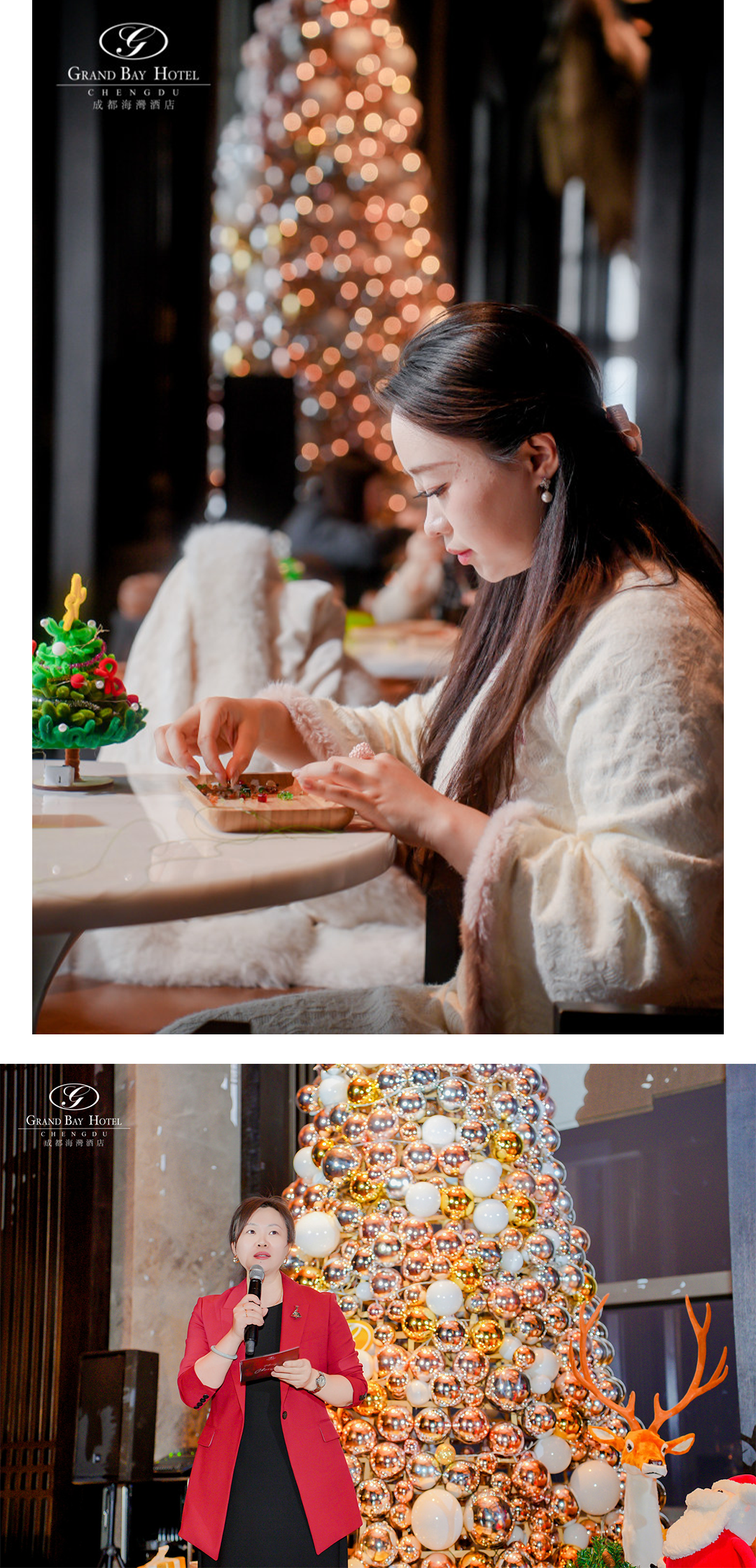 活动融合仪式感与互动体验,宾客首先在手作圣诞装饰工坊中创作,以亲手制作的饰物寄托祝福。随着夜幕降临,酒店总经理马艳女士登台致辞,向宾客致以问候,并表达了海湾酒店愿成为每位宾客节日记忆中温暖一页的愿景。