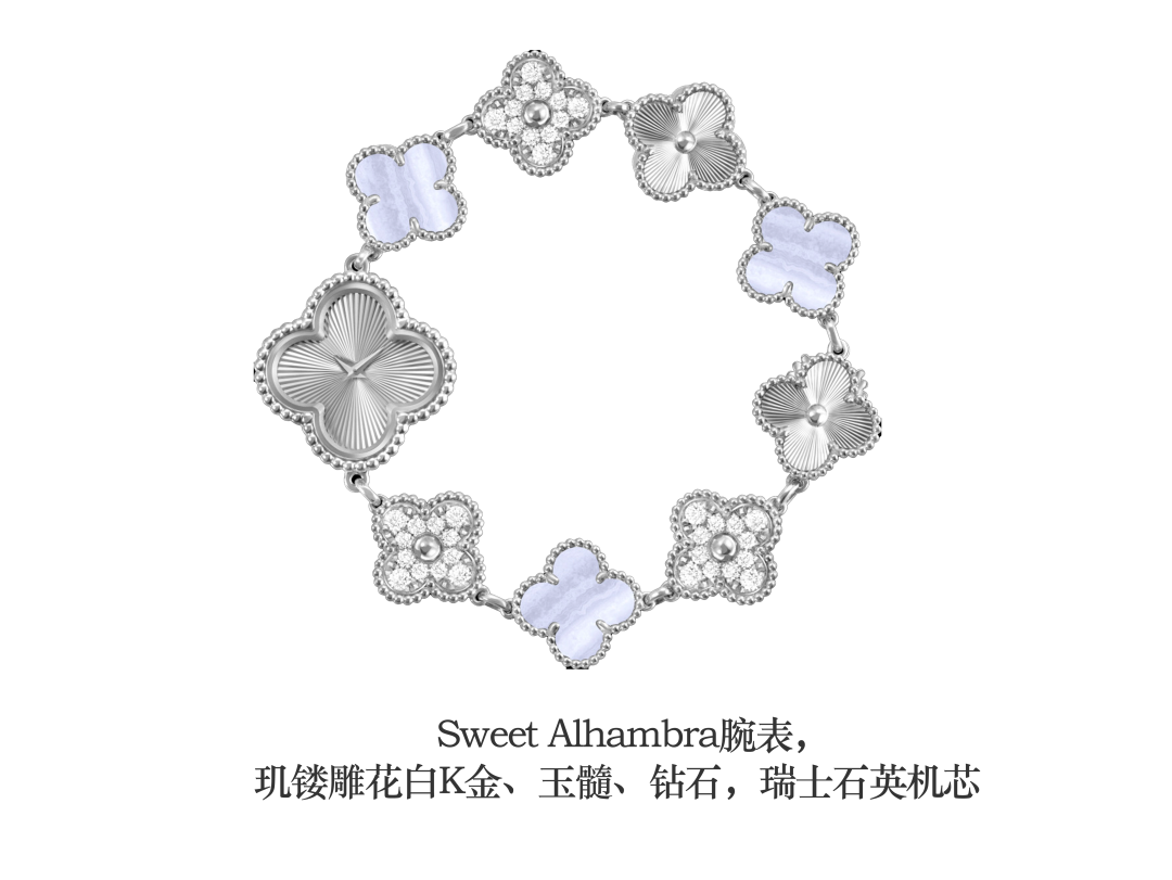 以全新材质呈现的Sweet Alhambra腕表则是延续了世家以珠宝雅述时光的传统。腕表的设计既秉承了Alhambra四叶幸运系列的经典元素,错落有致的四叶幸运主题图案融合玑镂雕花白K金、玉髓与钻石,谱写一阕全新的色彩变奏。