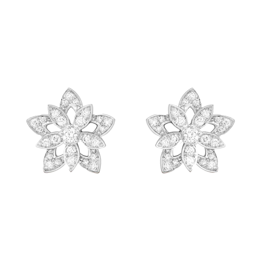 Lotus系列则展现了冬日中的纯净与宁静。莲花的形态象征着超越与升华,而钻石镶嵌的莲花图案在白K金的衬托下,愈加璀璨。每一朵花瓣都细致雕刻,钻石如露珠般点缀其中,展现了冬季清晨的清新与洁净。如同雪后初晴,莲花的光辉在白雪中绽放,带来一份心灵的安宁。