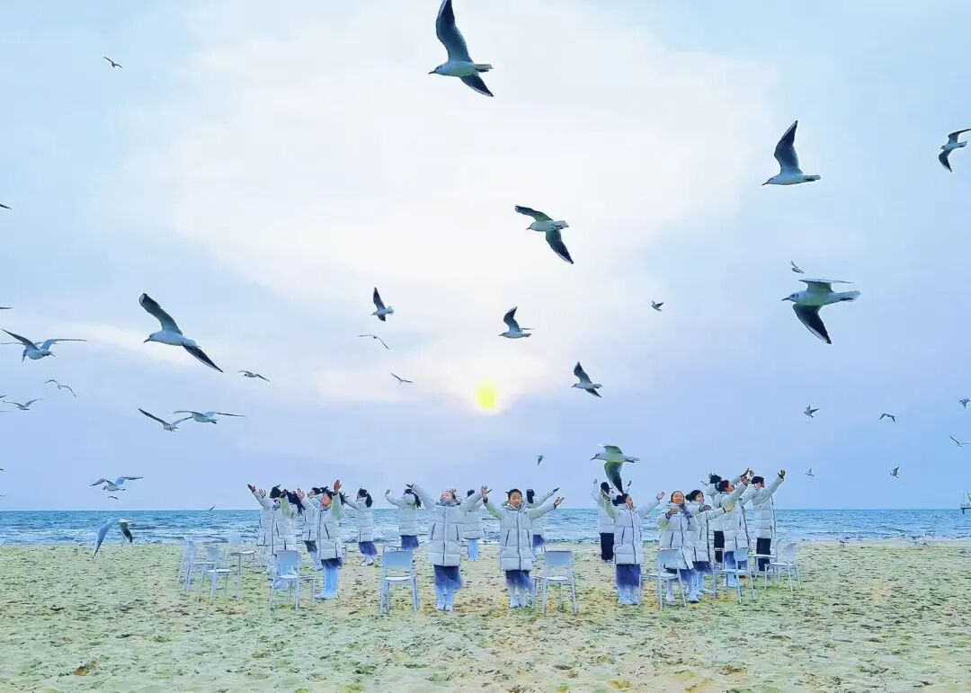 银河少年电视合唱团专场中“天地为幕”的沉浸式演出,将舞台延展至蔚蓝海岸,孩子们迎着破晓的霞光唱响《万疆》,清亮的歌声与翻涌的浪涛、盘旋的海鸥相映成趣,自然万物皆为伴奏,天地之间皆是舞台。孩子们踩着细软沙滩放声高歌,循着海风节奏调整气息,在与自然的互动中完成了最生动的艺术表达。
