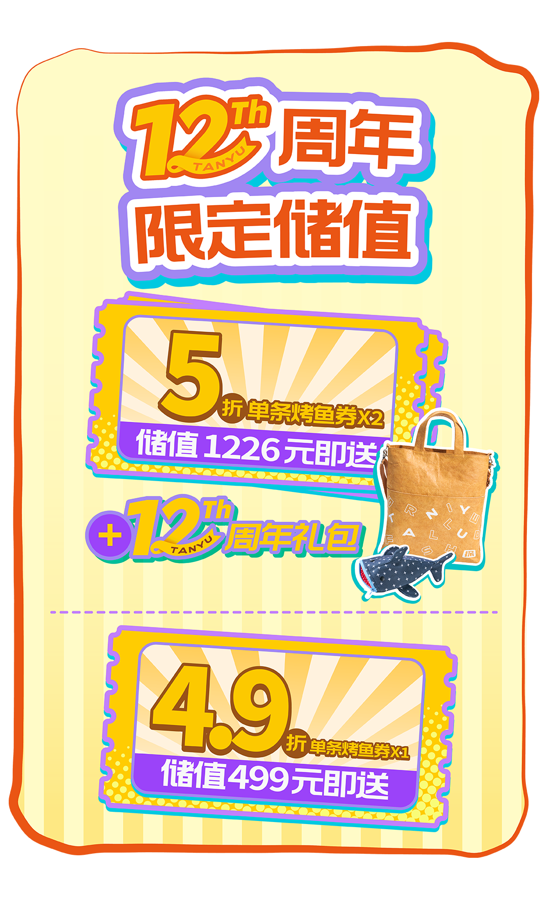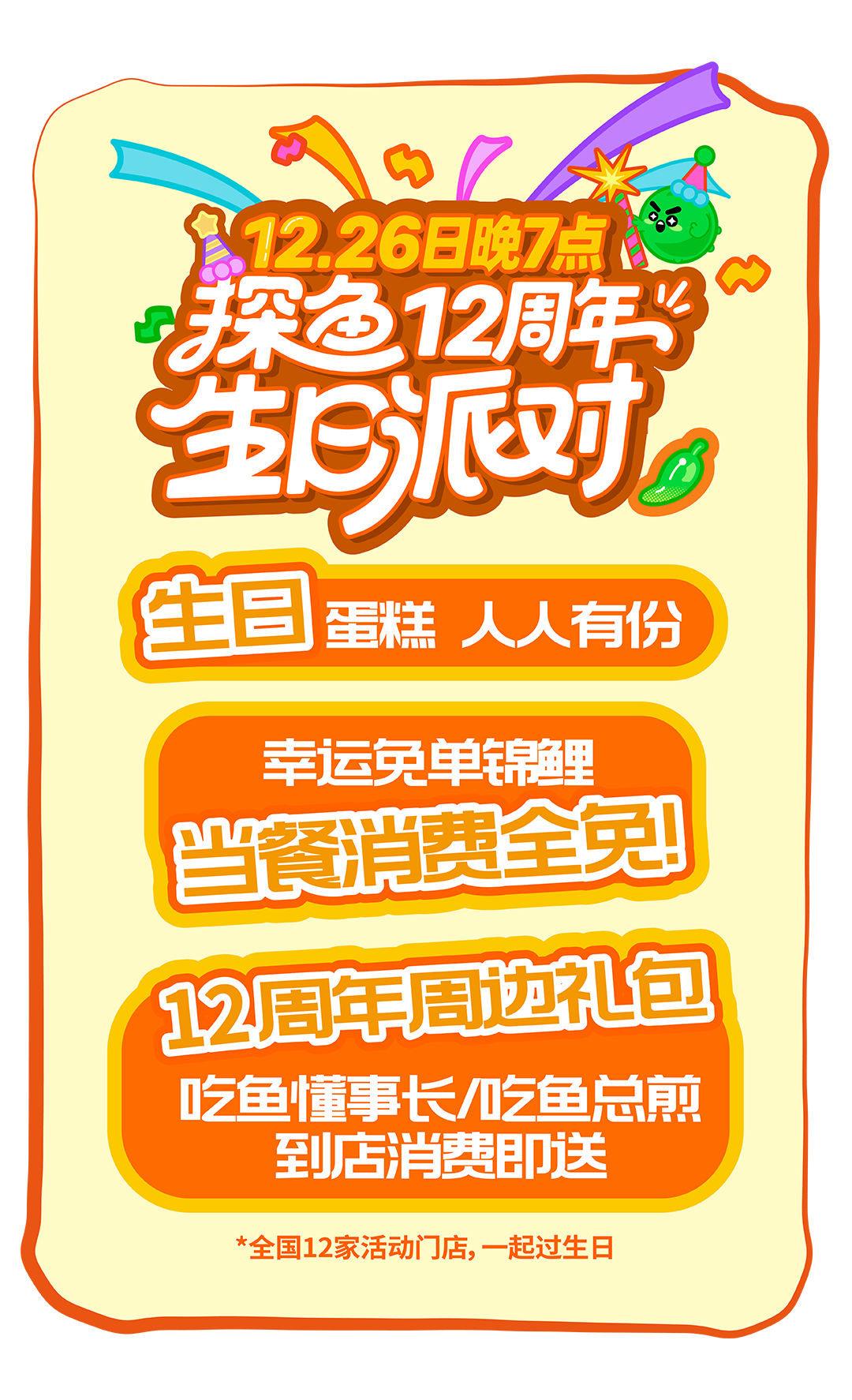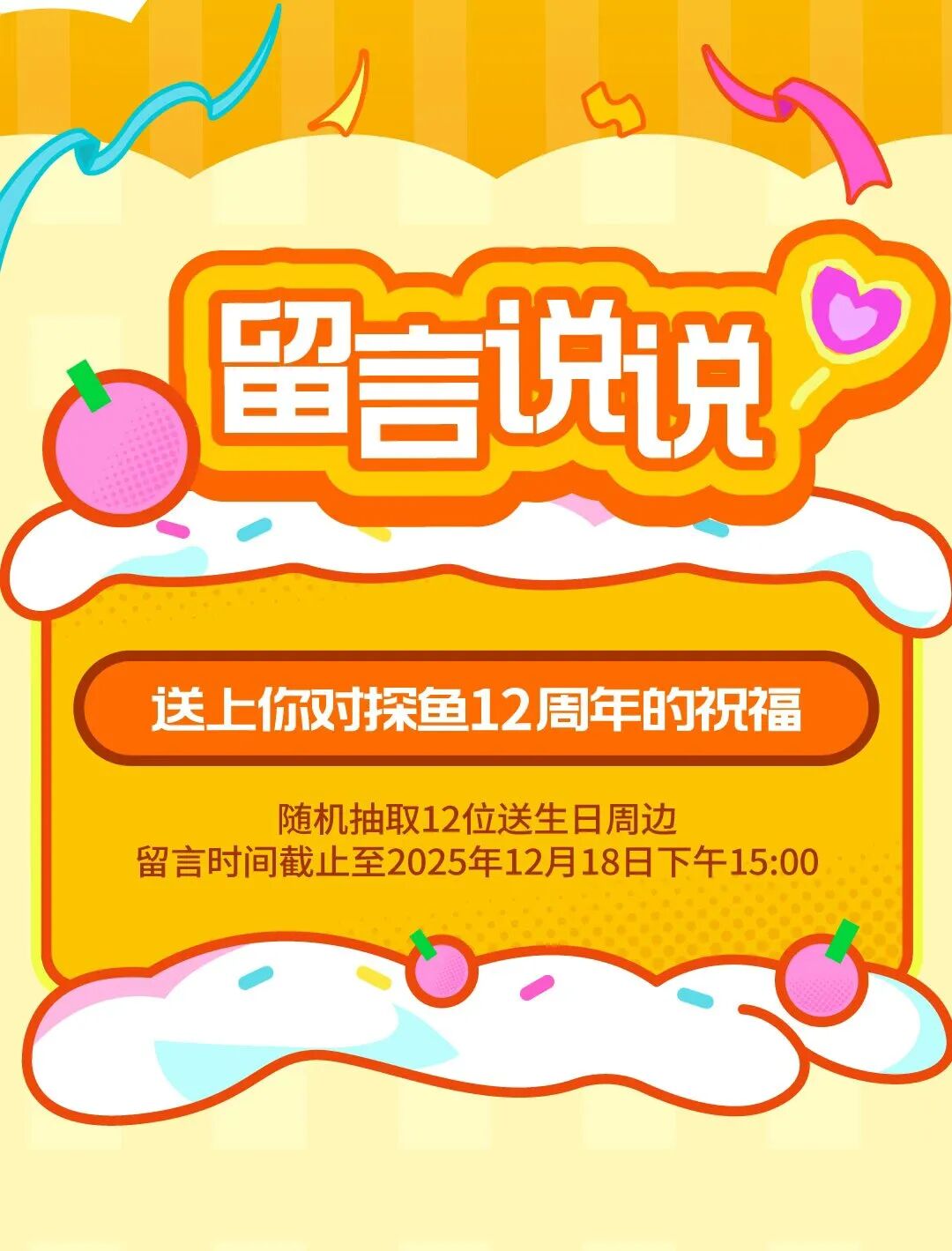 注:1.推文留言活动时间:2025年12月11日-2025年12月18日,2025年12月19日将在留言区公布留言中奖名单,奖品为生日周边一份;2.奖品以卡券形式发放至会员卡包,具体卡券有效期与使用规则,可在【探鱼烤鱼】小程序 -【我的】-【优惠券】卡券详情中查看;3.仅限大陆地区探鱼餐厅堂食使用,华为店不参与活动;4.每个订单仅可使用一张卡券,不可与其他优惠同享,餐前不设外带;