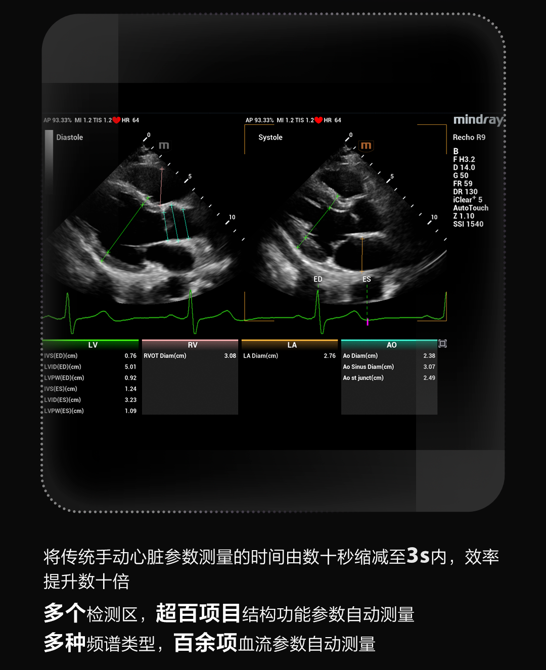 面对传统心脏超声检查中出现的“耗时”、“精度低”、“流程复杂”等问题,迈瑞心脏超声全栈AI评估解决方案通过构建从扫查到测量再到量化分析的AI生态闭环,将以往复杂、耗时的扫查流程大幅简化,有效提升日常心脏扫查效率,并配合更多AI应用评估,助力医生更快更高效的实现心脏临床诊断。
