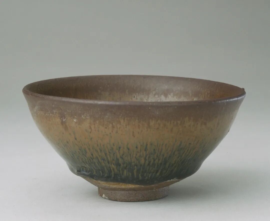 此盏是福建建窑制作。因釉中含铁量高,高温烧窑时釉质流动、结晶成细密条纹,状如兔毫,故名兔毫盏。