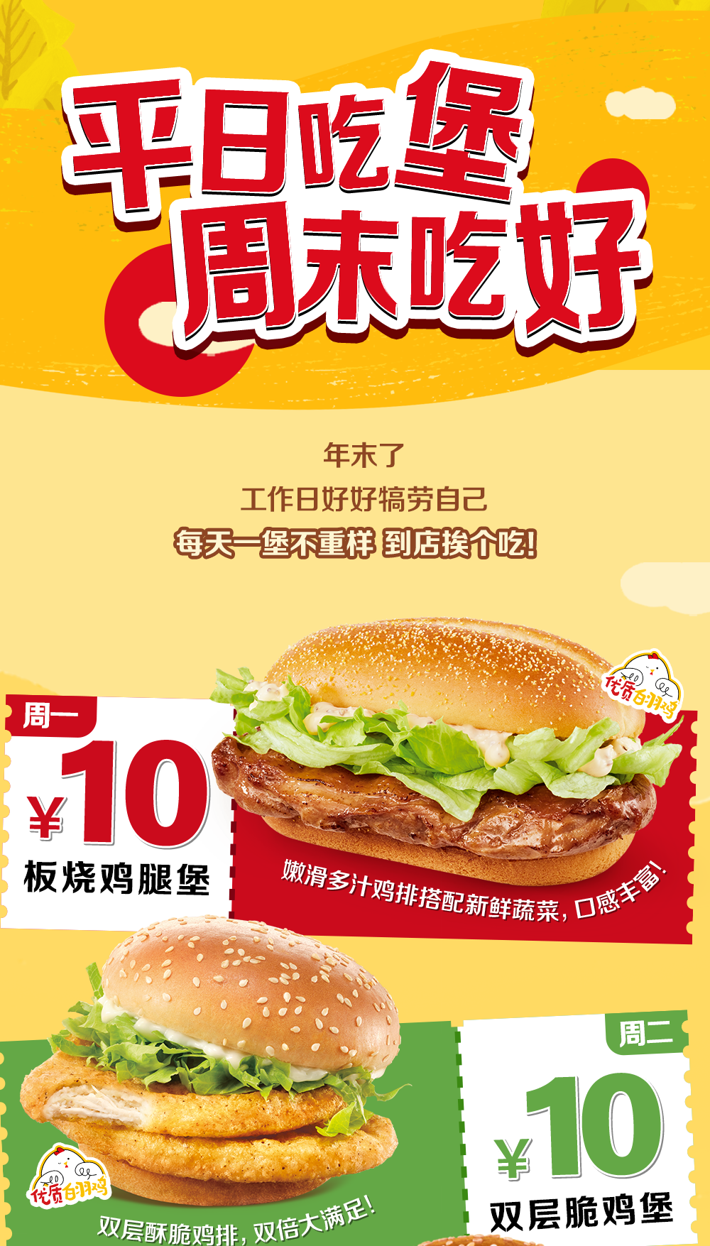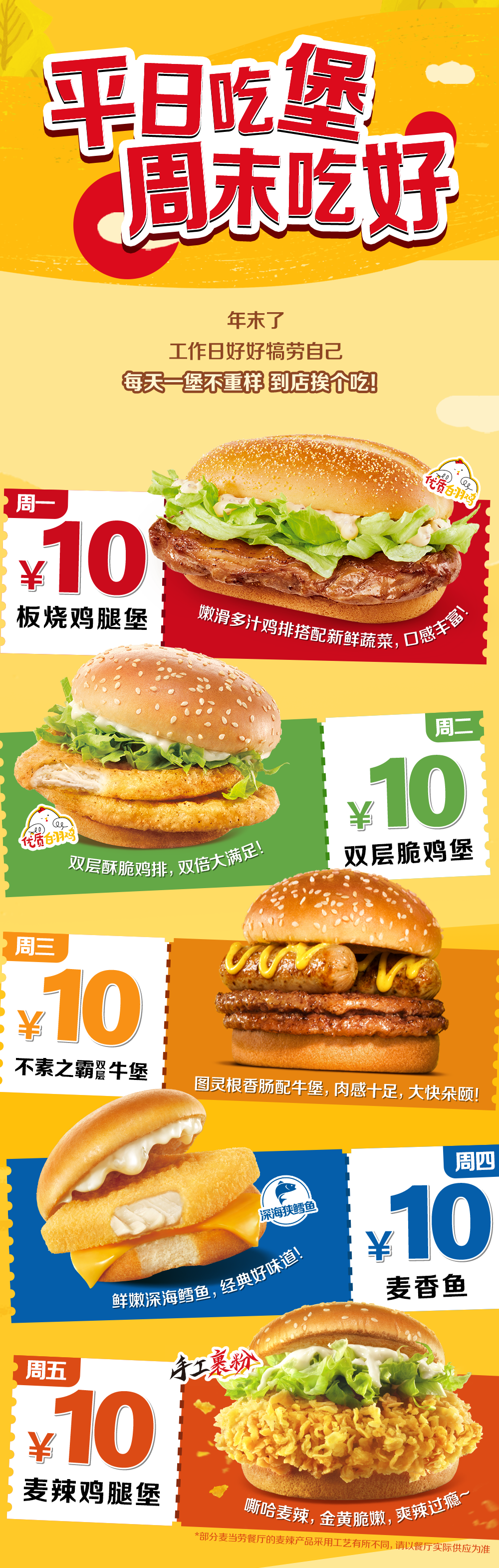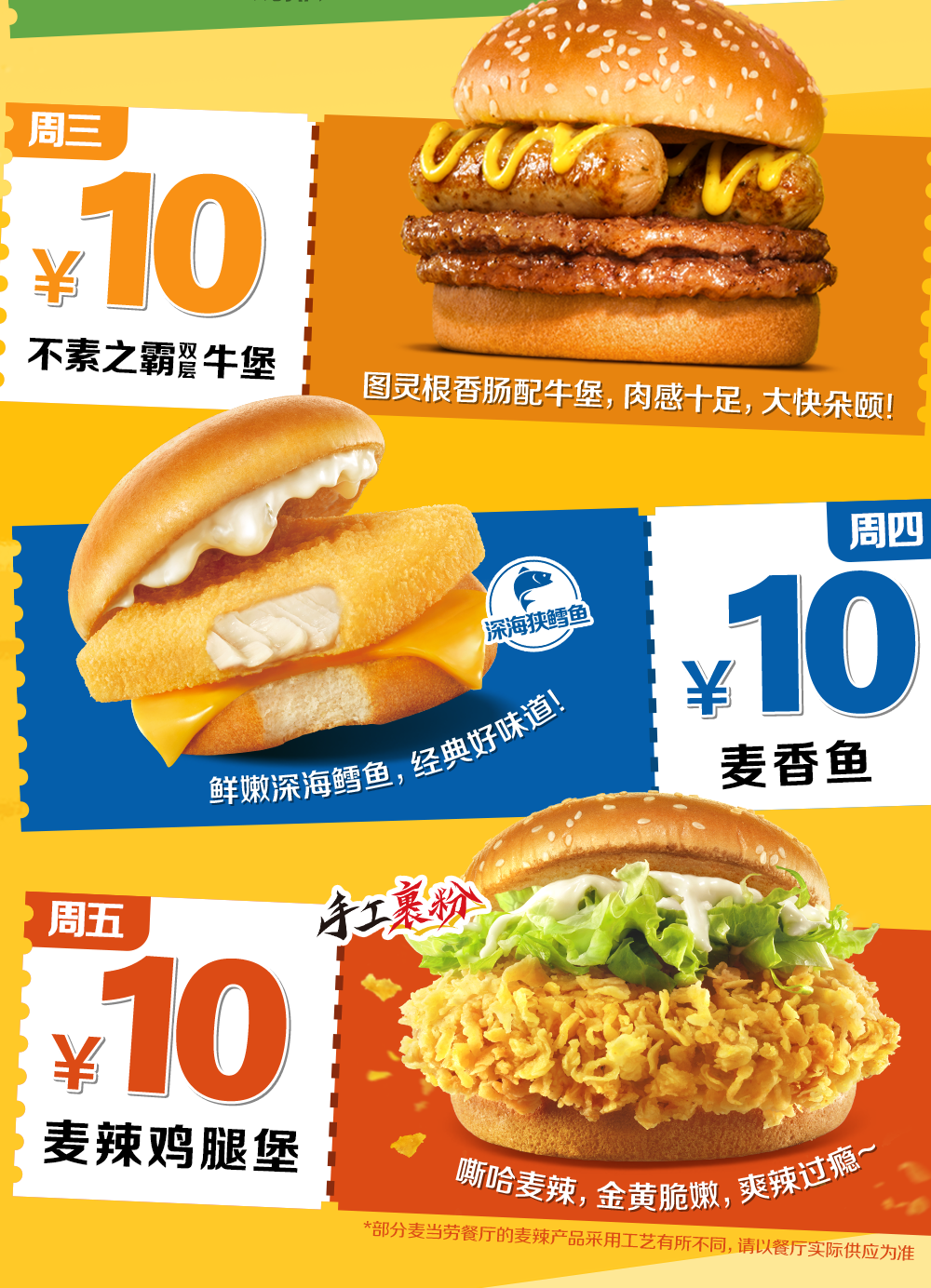 10元板烧鸡腿堡优惠券3张,10元双层脆鸡堡优惠券3张,10元巨无霸优惠券或10元不素之霸优惠券(新疆地区仅可领取10元巨无霸优惠券)共2张,10元麦香鱼优惠券2张,10元麦辣鸡腿堡优惠券2张,以上优惠券仅限麦当劳APP/小程序到店取餐功能可用,工作日每日可用一张指定当日可用优惠券。