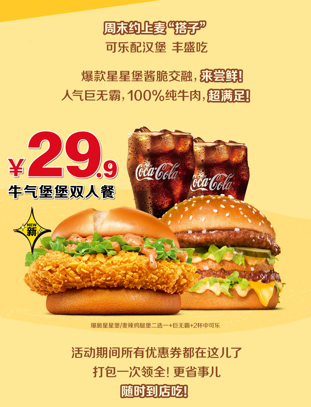 29.9元牛气堡堡双人餐优惠券2张,以上优惠券仅限周六/周日通过麦当劳APP/小程序到店取餐功能可用,每日可用一张指定当日可用优惠券。