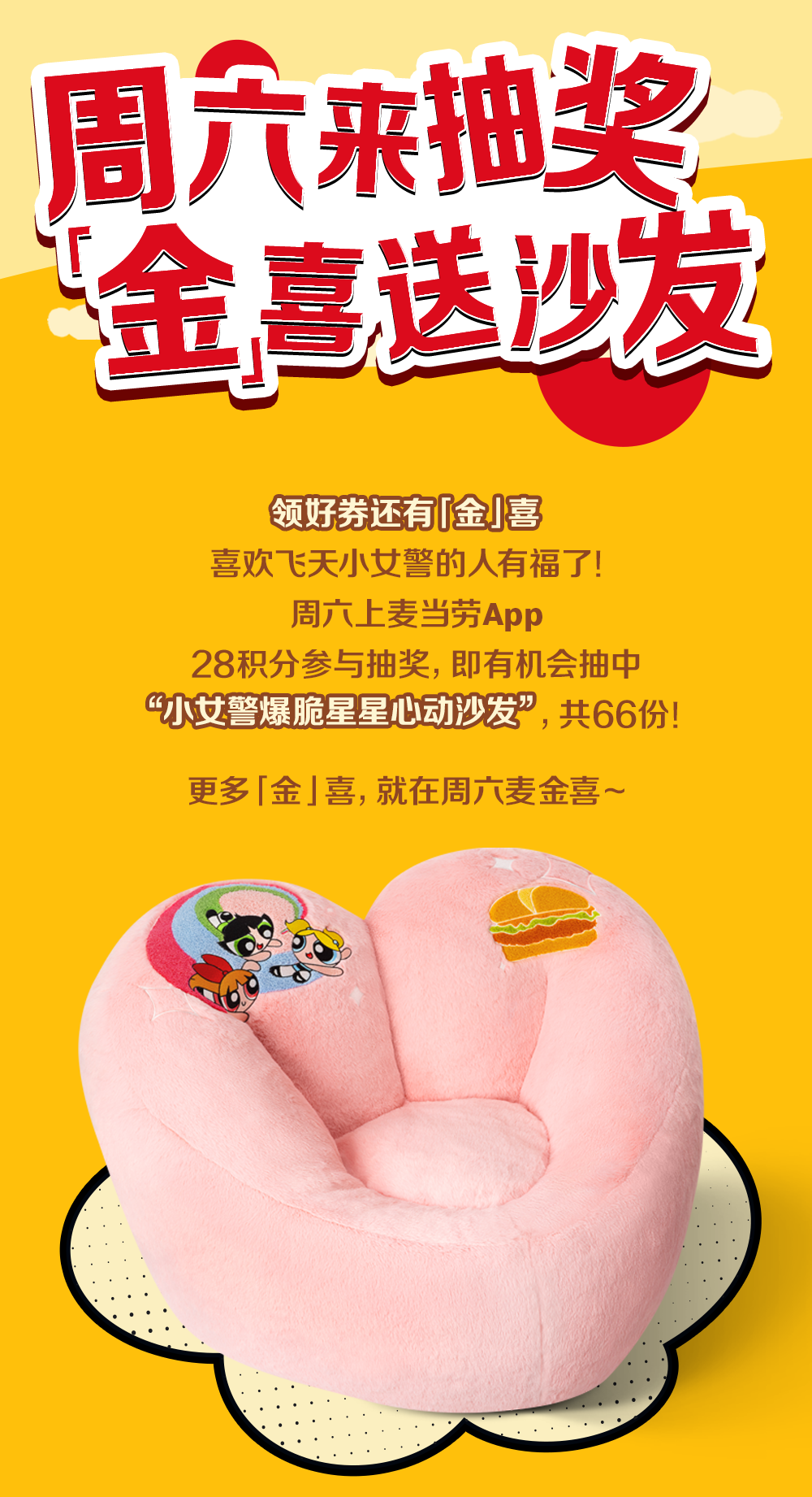 仅限麦当劳用户在12月20日当天,登录麦当劳App【大抽奖】界面参与抽奖。“小女警爆脆星星心动沙发”及各奖品详情、限量数及兑奖方式等规则详见活动页规则。请您将麦当劳App升级到最新版本方能参与本活动。食品及包装以实物为准,图片仅供参考。