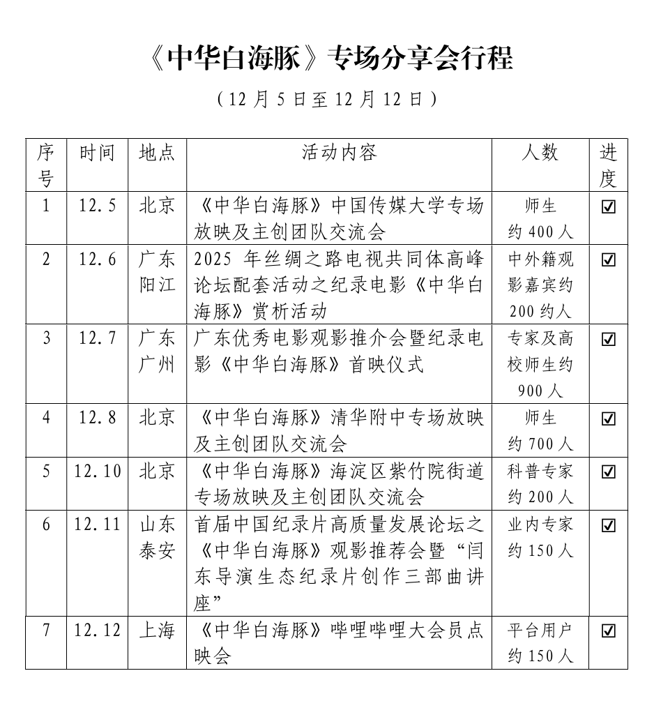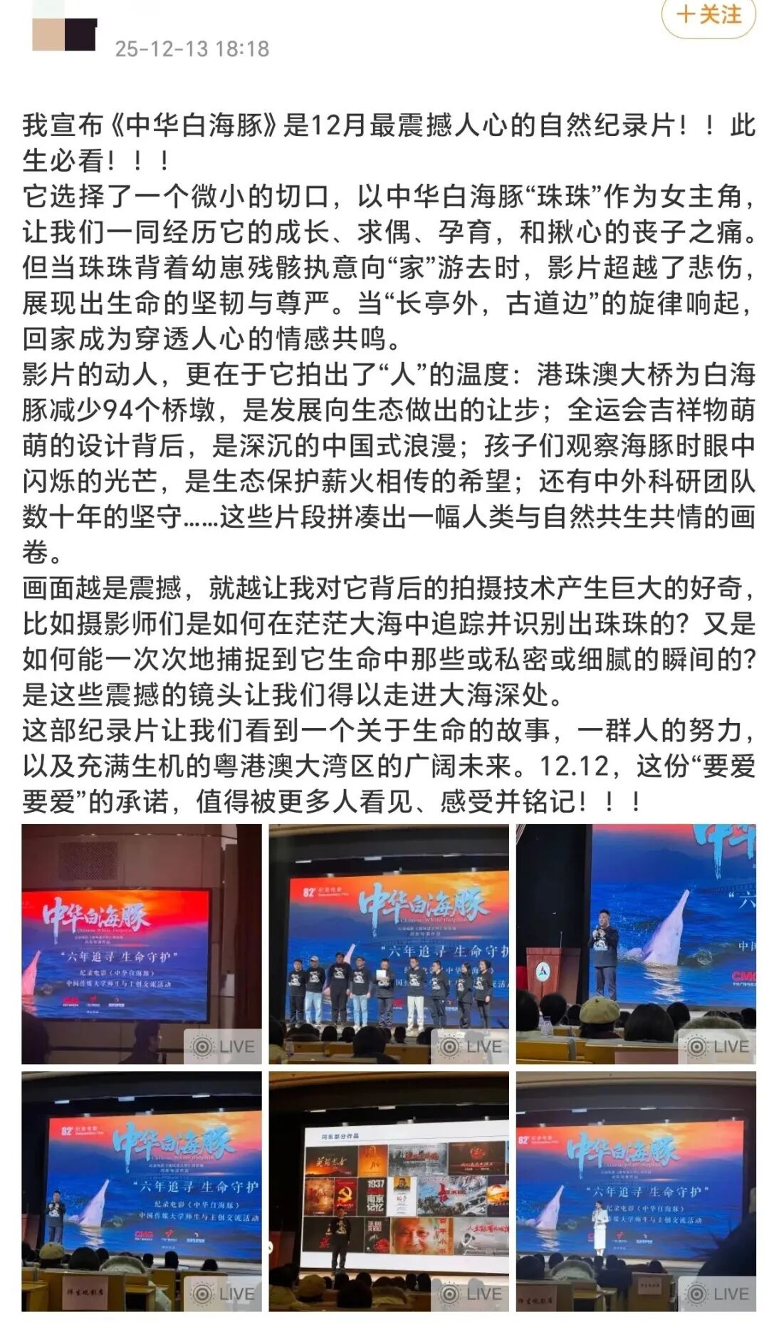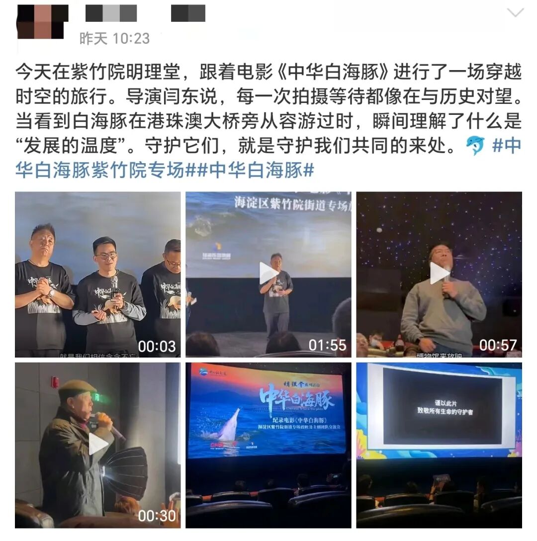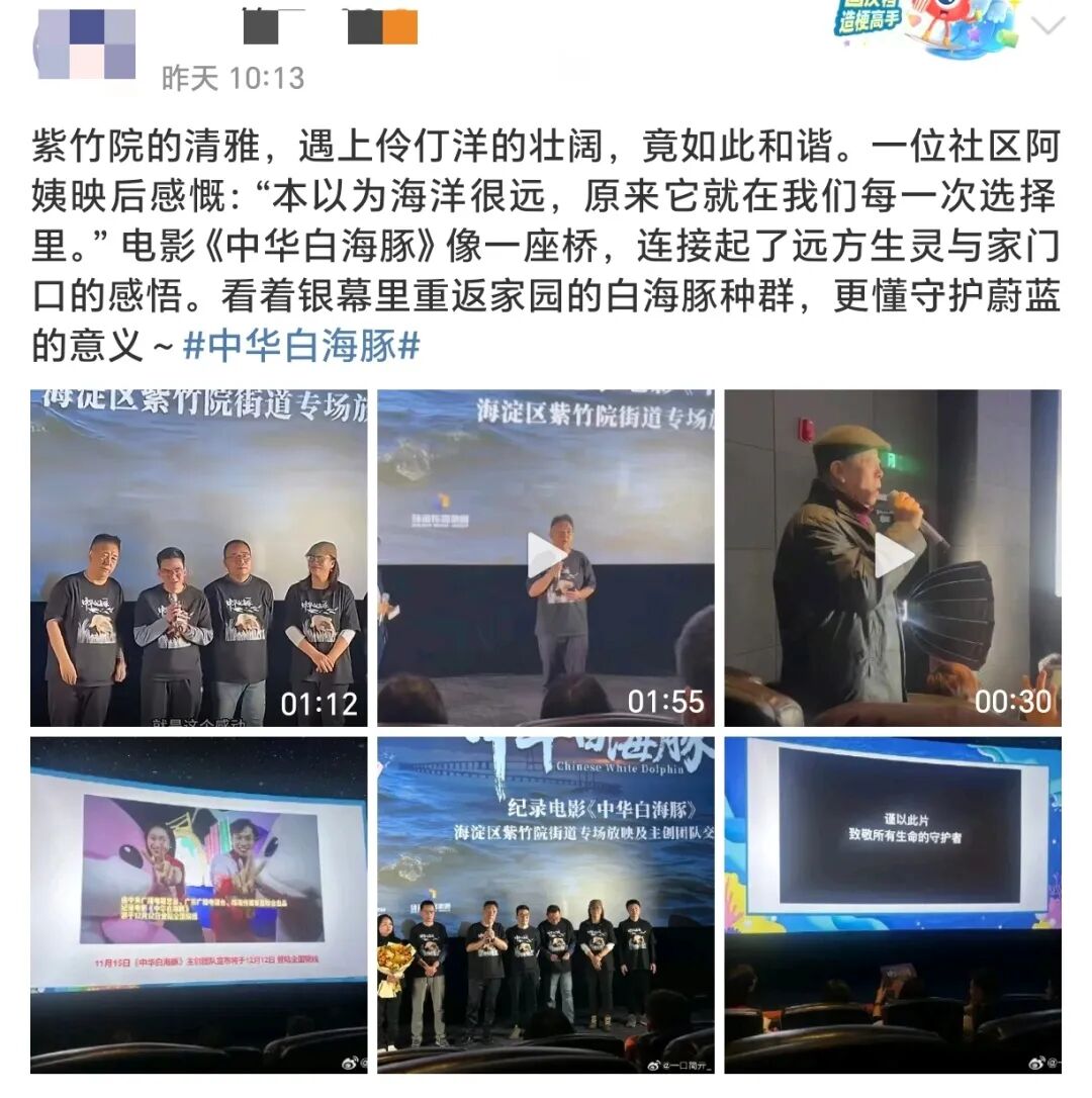 因此,自官宣定档以来,他和团队精心设计点映路线,分享团队与中华白海豚的创作故事。从氛围感十足的十五运会现场,到广东优秀电影观影推介会、2025首届中国纪录片高质量发展论坛、2025年丝绸之路电视共同体高峰论坛配套活动等业内乃至国际论坛,从中国传媒大学、清华附中等校园,到海淀区紫竹院基层社区和视频平台的线下分享会,和观众们的深入交流,已悄然成为影片的一部分。