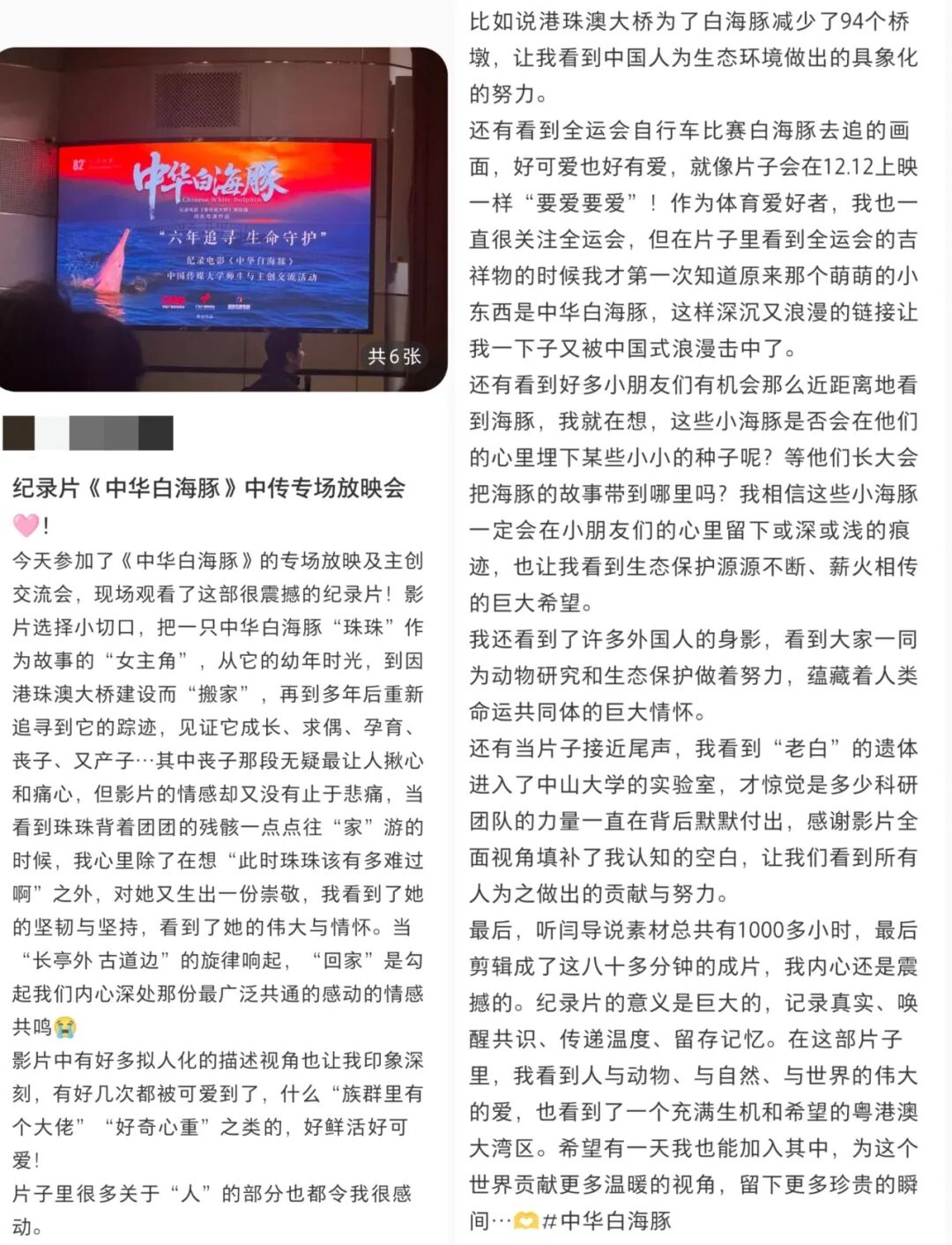 “泪目!在影片中看到了我的老师和同事,从保护白鱀豚到中华白海豚这些几代科学家的努力,影片都记录下来了......”