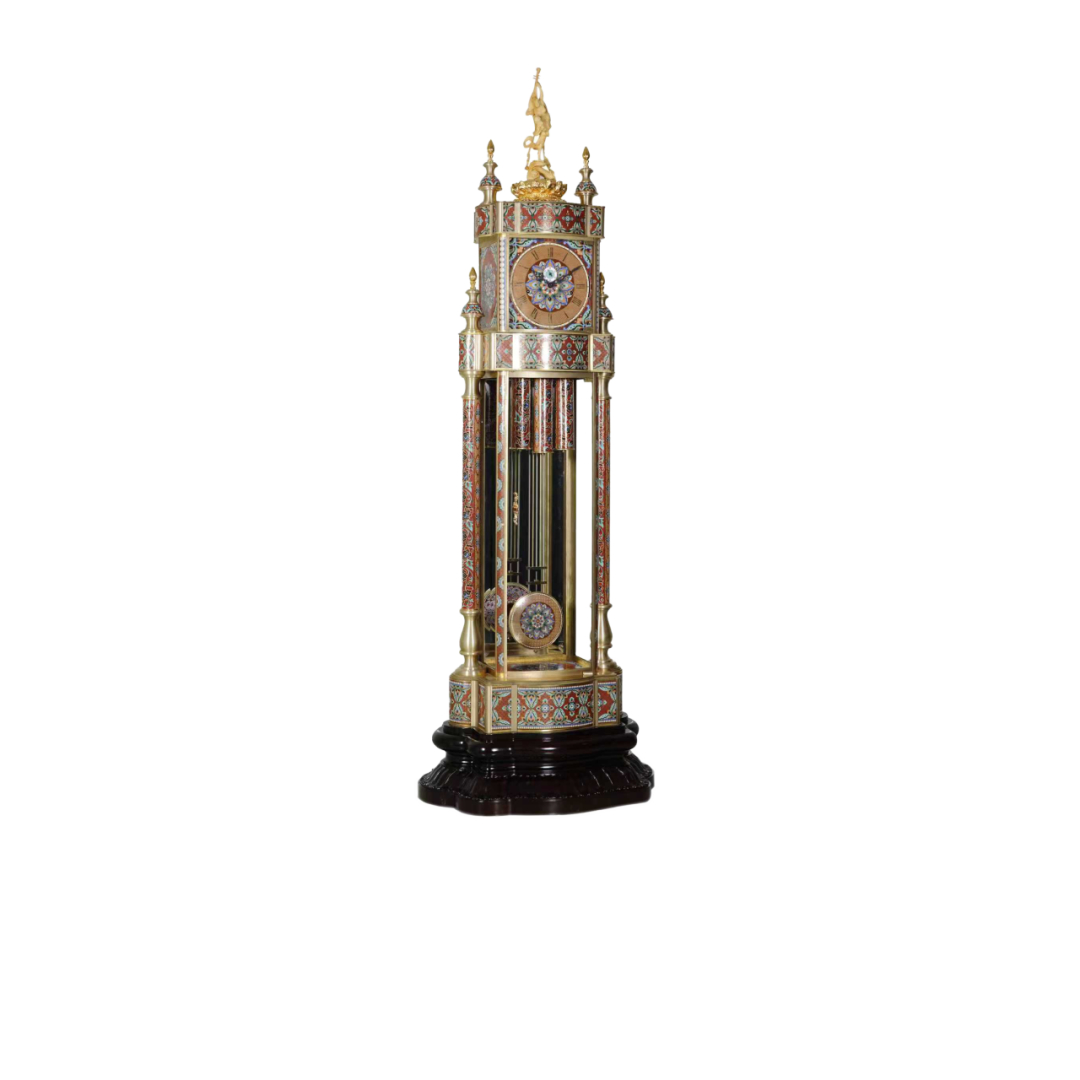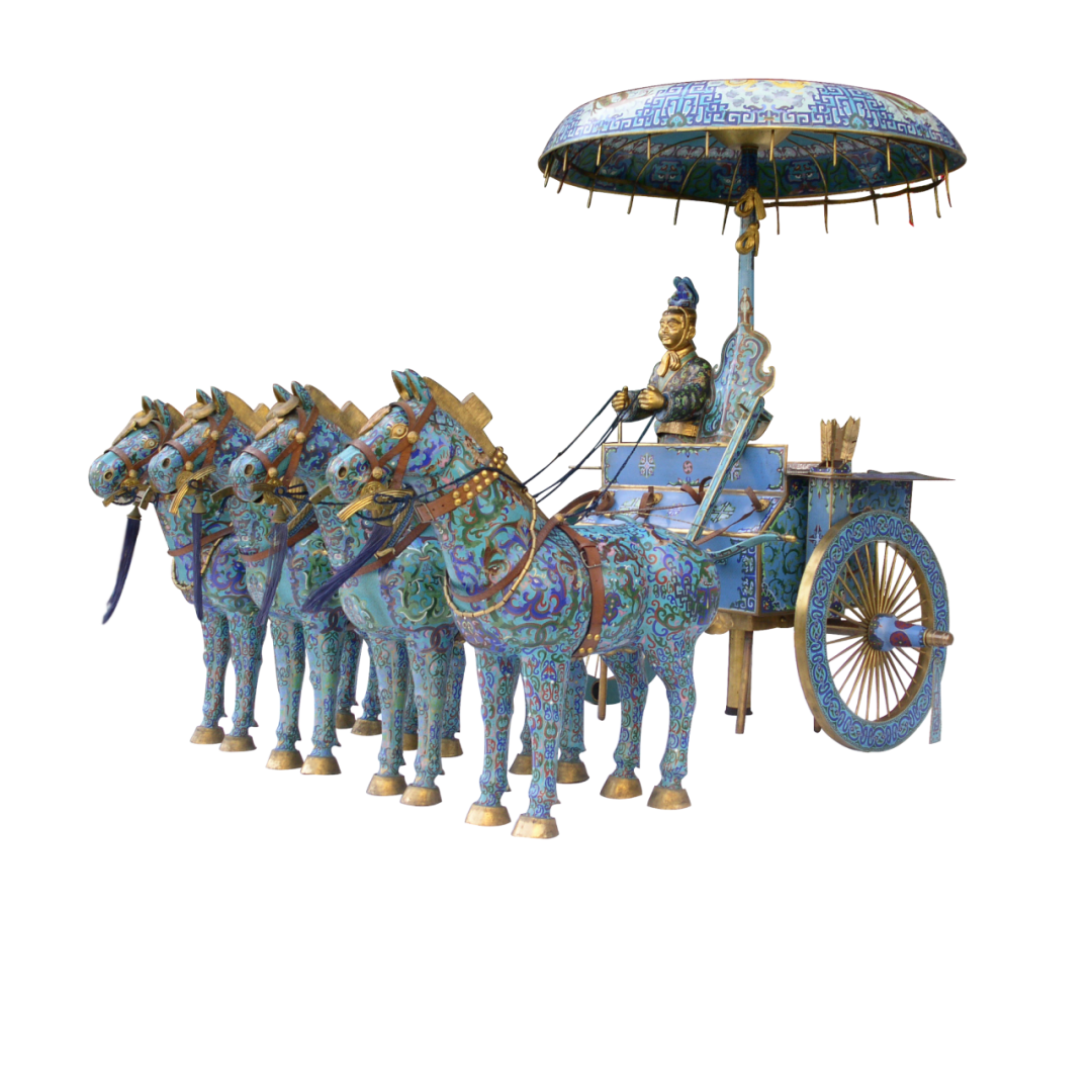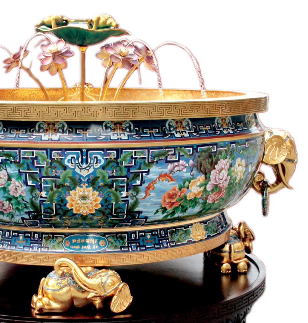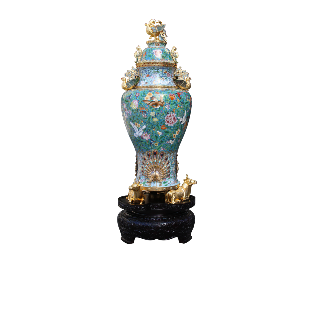 自元代沿丝绸之路迤逦而来,经明清两代宫廷匠心的千锤百炼,成为中华工艺美学的一座高峰。制胎、掐丝、点蓝、烧蓝、镀金、磨光——繁复工序方能成就一件景泰蓝的璀璨华光。铜板在工匠手中成型为骨,纤细铜丝被精心盘曲为画,釉料化作斑斓彩绘填入其中,再经历烈火熔炼与反复打磨,终成流光溢彩的艺术精品。