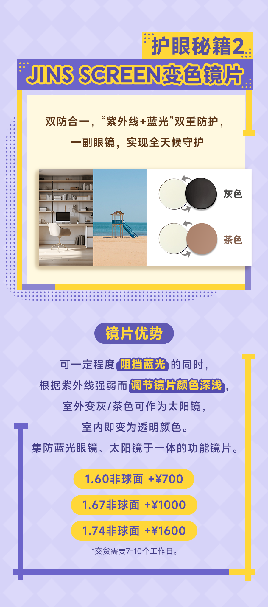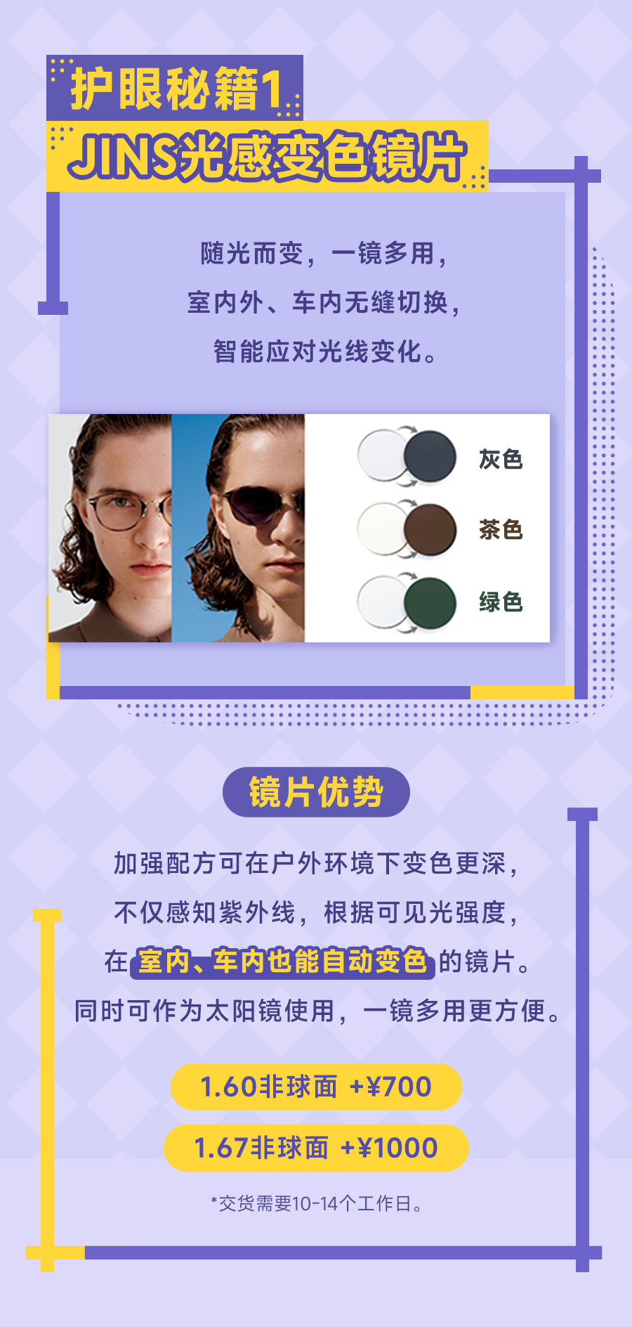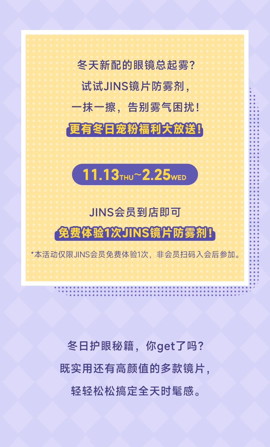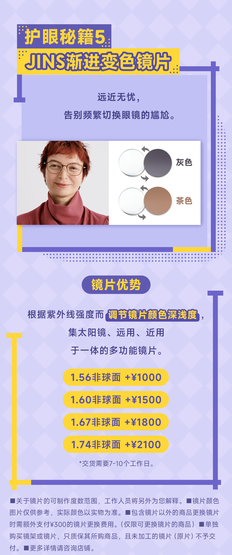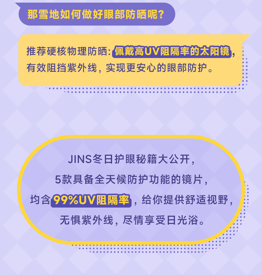 {"品牌": "JINS睛姿","主题": "科普冬季紫外线对眼周肌肤的伤害,并介绍JINS多款具备高防护功能的眼镜镜片,提供全天候护眼解决方案","产品": "JINS光感变色镜片、JINS SCREEN变色镜片、JINS驾驶专用镜片(白天/夜间)、JINS轻晰真视SCREEN镜片、JINS渐进变色镜片","目标人群": "关注眼周肌肤健康、需长时间户外活动或驾驶、有防紫外线/防蓝光需求、尤其是散光或度数较高的消费者", "推荐标签": "冬季防晒、防紫外线镜片、防蓝光眼镜、驾驶专用镜片、JINS镜片、眼周护理、护眼秘籍"}