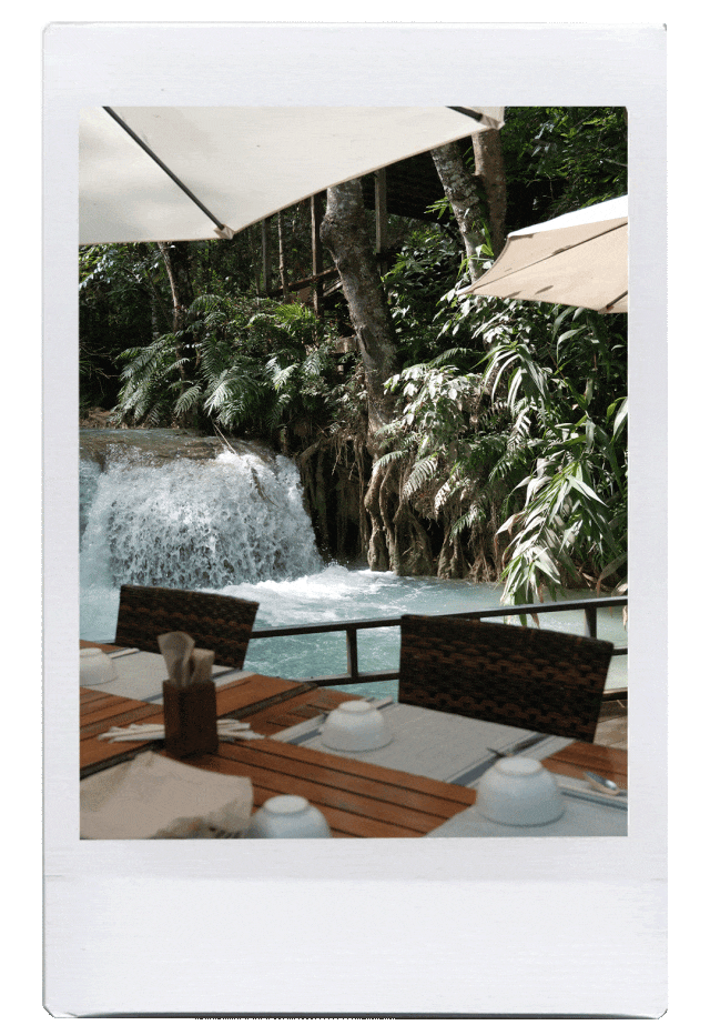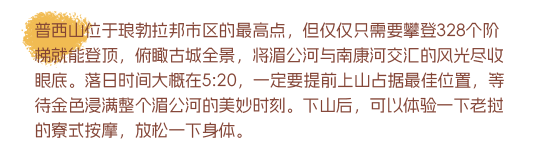 除了人文体验,琅勃拉邦的自然观光也是被各国游客津津乐道的。打卡号称“老挝九寨沟”的光西瀑布,既能看百米瀑布群,还能玩绳索跳水(不太确定是否目前能够跳水,我们去的时候,已经挂上了禁止入内的牌子);登顶普西山,俯瞰全城风貌,和各国朋友一起迎接一场完美的日落;傍晚在湄公河游船上,享用晚餐,享受河畔风光,更是一场浪漫惬意的体验。