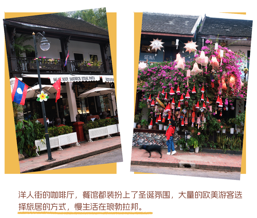 大概在20世纪80年代,琅勃拉邦这个充满神秘东方色彩的古城逐渐进入欧美旅行者视野。城内主要街道Sisavangvong被称为“洋人街”,当我们走在这条街上时,会发现各国游客多到超过本地人,加上法式风格融入在地风格的临街建筑、庭院、餐厅、酒吧......多种风格混合杂糅,如调酒一般,“调”出了琅勃拉邦的别样风情。