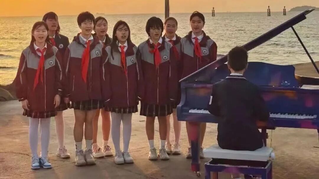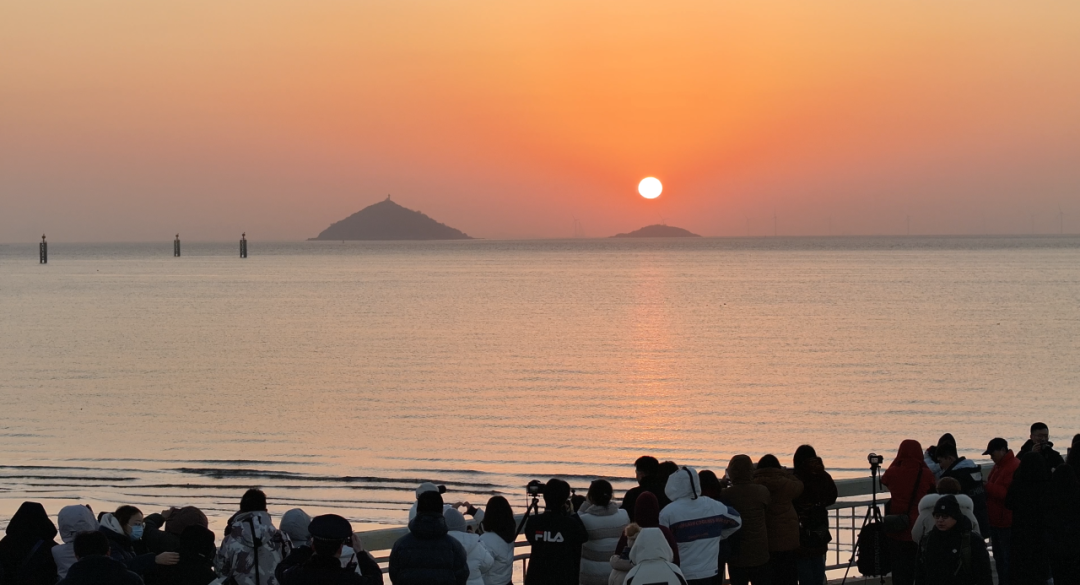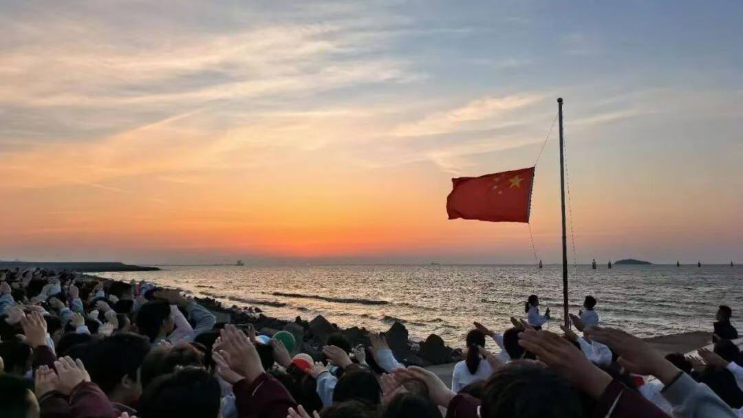 鲜艳的五星红旗伴随国歌缓缓升起,与海上日出交相辉映。在开阔的滨海天地间,感受家国情怀与新年希望的交融。