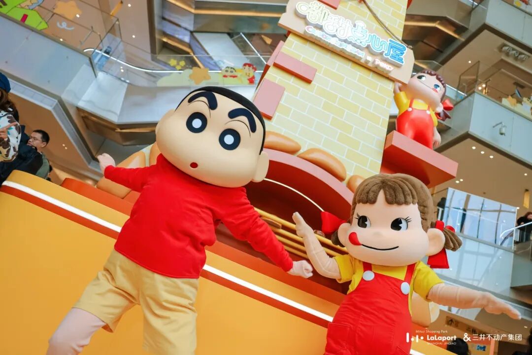 扶梯玻璃上绘满小新与PEKO的忙碌身影
