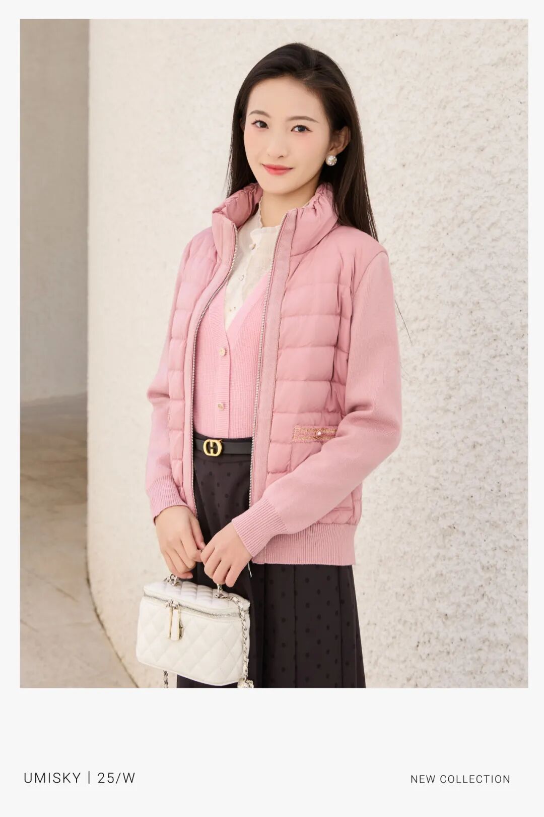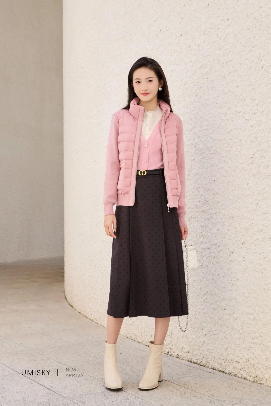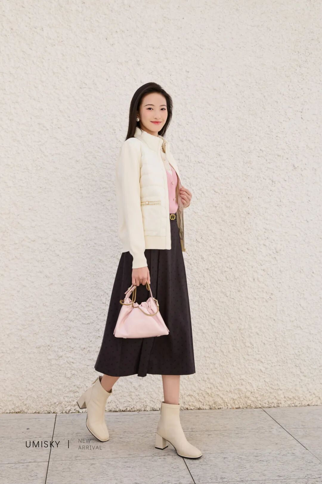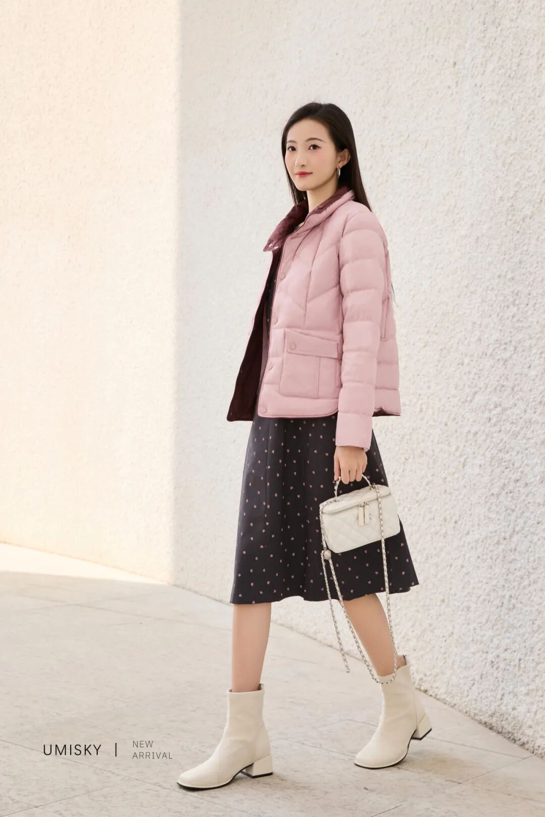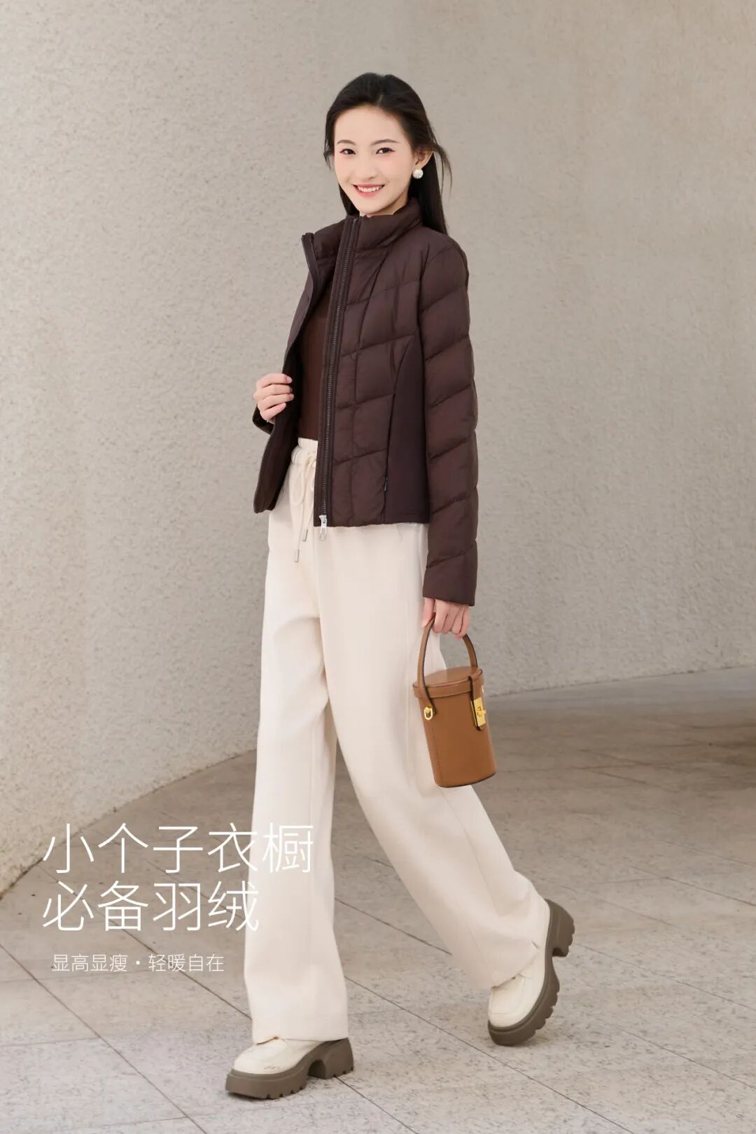 它不压身高,不拖沓身形,搭配高腰裤或半裙,轻松勾勒出腰线,显得人挺拔精神。鹅绒填充保证了温暖,而轻盈的特性又让行动无拘束。