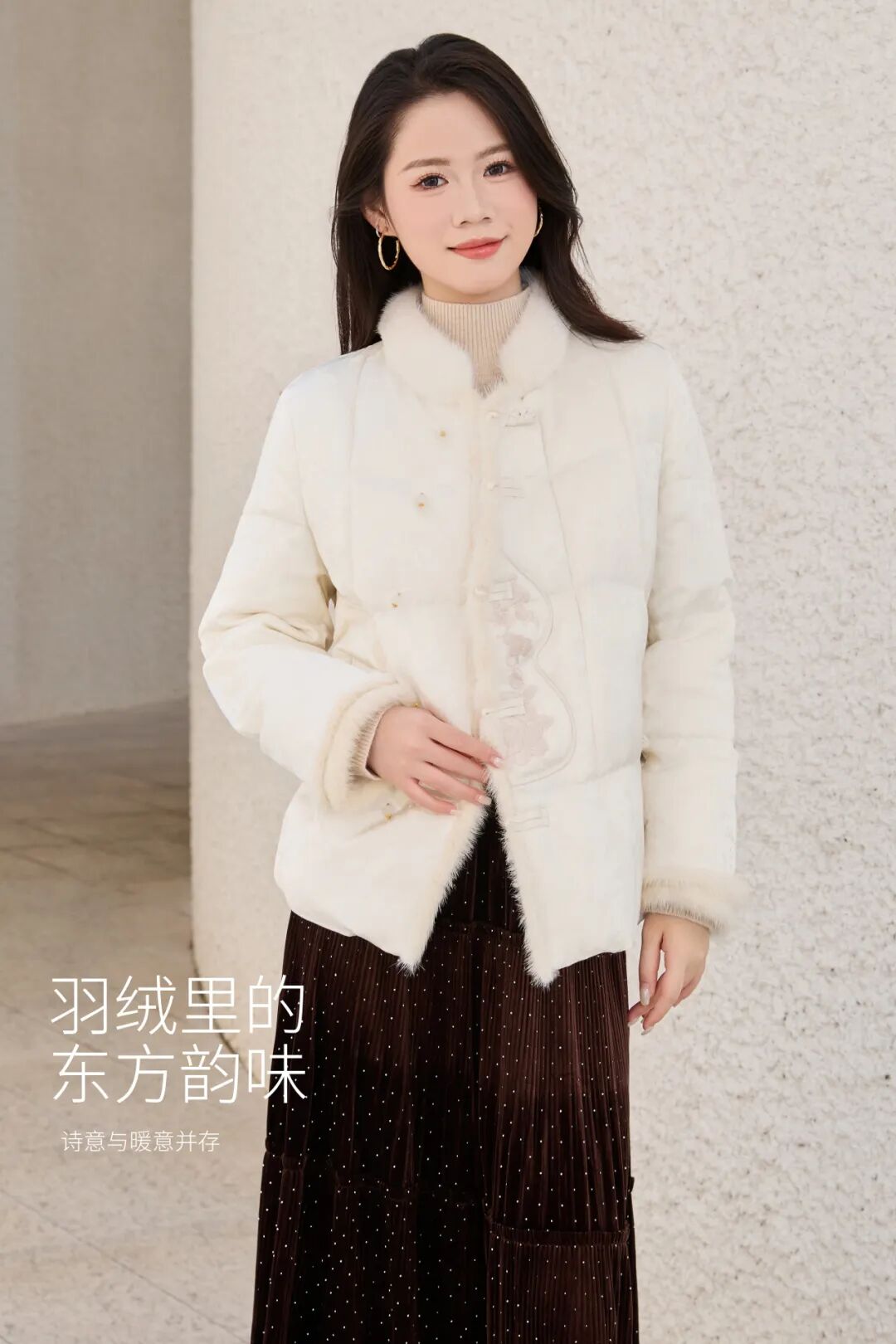 盘扣、流苏、立领,或是国风刺绣,在羽绒的蓬松轮廓下,更显细腻而雅致。羽绒的轻柔,与国风的含蓄相得益彰,仿佛把冬日的暖意,穿成一首安静的诗。