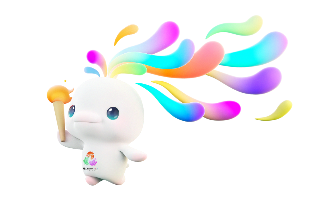 这两只萌物的头顶可不是“鸡冠”,而是三色浪花,融合了广东木棉红、香港紫荆紫和澳门莲花绿,分别代表广东、香港、澳门三个联合承办本届赛事的地区。从正面看,这三色浪花还构成了一颗爱心的形状❤️,寓意着三地同心;而为海豚添上手和脚,是为了更好表现运动姿态与动态美感。